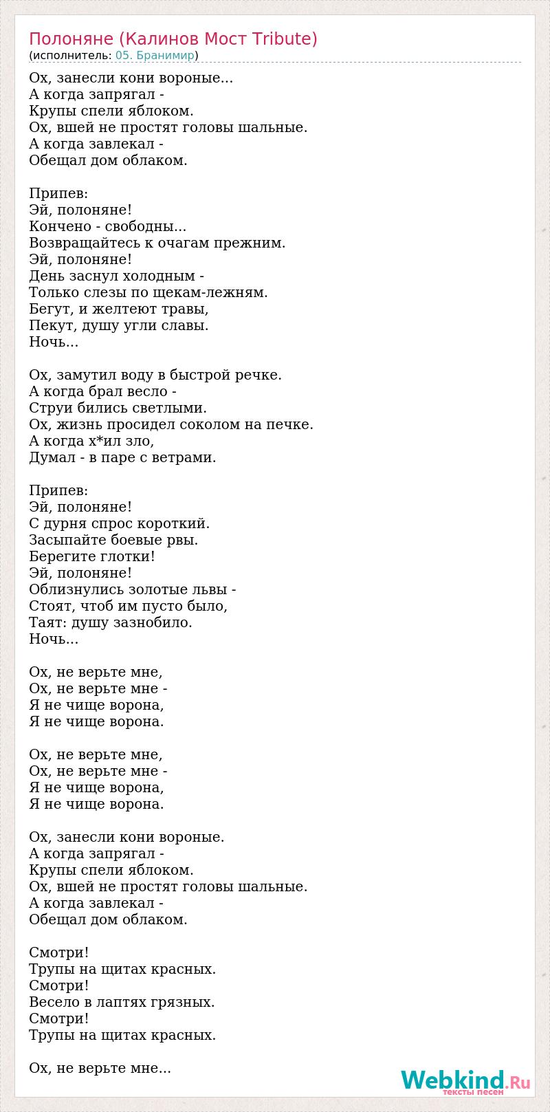 Ох, занесли кони вороные... А когда запрягал - Крупы спели яблоком. Ох, вшей не простят головы шальные. А когда завлекал - Обещал дом облаком. Припев: Эй, полоняне! Кончено - свободны... Возвращайтесь к очагам прежним. Эй, полоняне! День заснул холодным - Только слезы по щекам-лежням. Бегут, и желтеют травы, Пекут, душу угли славы. Ночь... Ох, замутил воду в быстрой речке. А когда брал весло - Струи бились светлыми. Ох, жизнь просидел соколом на печке. А когда х*ил зло, Думал - в паре с ветрами. Припев: Эй, полоняне! С дурня спрос короткий. Засыпайте боевые рвы. Берегите глотки! Эй, полоняне! Облизнулись золотые львы - Стоят, чтоб им пусто было, Таят: душу зазнобило. Ночь... Ох, не верьте мне, Ох, не верьте мне - Я не чище ворона, Я не чище ворона. Ох, не верьте мне, Ох, не верьте мне - Я не чище ворона, Я не чище ворона. Ох, занесли кони вороные. А когда запрягал - Крупы спели яблоком. Ох, вшей не простят головы шальные. А когда завлекал - Обещал дом облаком. Смотри! Трупы на щитах красных. Смотри! Весело в лаптях грязных. Смотри! Трупы на щитах красных. Ох, не верьте мне...