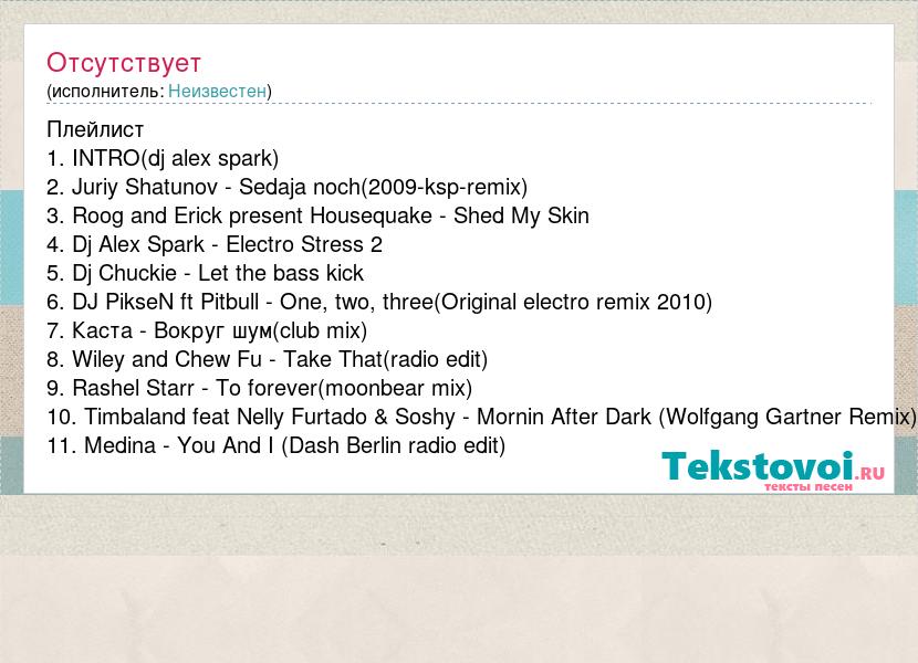 Плейлист 1. INTRO(dj alex spark) 2. Juriy Shatunov - Sedaja noch(2009-ksp-remix) 3. Roog and Erick present Housequake - Shed My Skin 4. Dj Alex Spark - Electro Stress 2 5. Dj Chuckie - Let the bass kick 6. DJ PikseN ft Pitbull - One, two, three(Original electro remix 2010) 7. Каста - Вокруг шум(club mix) 8. Wiley and Chew Fu - Take That(radio edit) 9. Rashel Starr - To forever(moonbear mix) 10. Timbaland feat Nelly Furtado & Soshy - Mornin After Dark (Wolfgang Gartner Remix) 11. Medina - You And I (Dash Berlin radio edit)