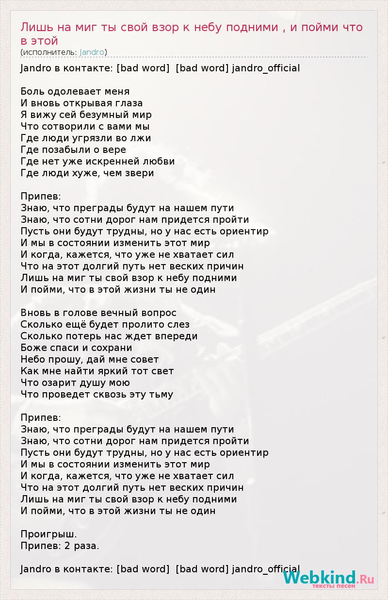 Jandro в контакте: [bad word] [bad word] jandro_official Боль одолевает меня И вновь открывая глаза Я вижу сей безумный мир Что сотворили с вами мы Где люди угрязли во лжи Где позабыли о вере Где нет уже искренней любви Где люди хуже, чем звери Припев: Знаю, что преграды будут на нашем пути Знаю, что сотни дорог нам придется пройти Пусть они будут трудны, но у нас есть ориентир И мы в состоянии изменить этот мир И когда, кажется, что уже не хватает сил Что на этот долгий путь нет веских причин Лишь на миг ты свой взор к небу подними И пойми, что в этой жизни ты не один Вновь в голове вечный вопрос Сколько ещё будет пролито слез Сколько потерь нас ждет впереди Боже спаси и сохрани Небо прошу, дай мне совет Как мне найти яркий тот свет Что озарит душу мою Что проведет сквозь эту тьму Припев: Знаю, что преграды будут на нашем пути Знаю, что сотни дорог нам придется пройти Пусть они будут трудны, но у нас есть ориентир И мы в состоянии изменить этот мир И когда, кажется, что уже не хватает сил Что на этот долгий путь нет веских причин Лишь на миг ты свой взор к небу подними И пойми, что в этой жизни ты не один Проигрыш. Припев: 2 раза. Jandro в контакте: [bad word] [bad word] jandro_official