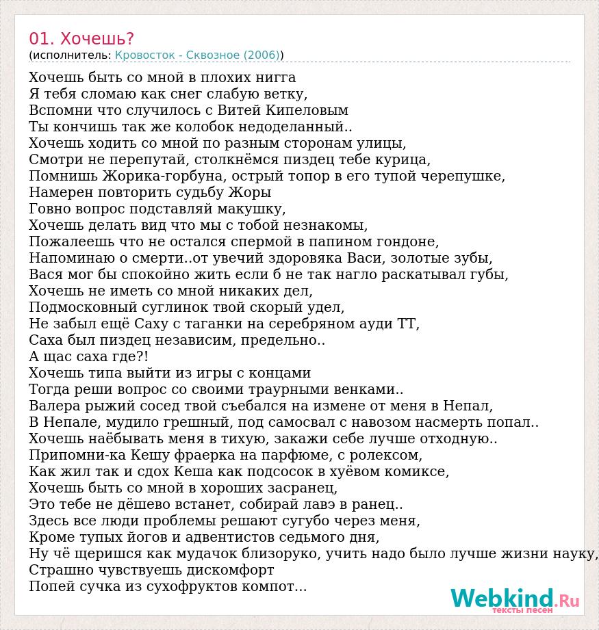 Хочешь быть со мной в плохих нигга Я тебя сломаю как снег слабую ветку, Вспомни что случилось с Витей Кипеловым Ты кончишь так же колобок недоделанный.. Хочешь ходить со мной по разным сторонам улицы, Смотри не перепутай, столкнёмся пиздец тебе курица, Помнишь Жорика-горбуна, острый топор в его тупой черепушке, Намерен повторить судьбу Жоры Говно вопрос подставляй макушку, Хочешь делать вид что мы с тобой незнакомы, Пожалеешь что не остался спермой в папином гондоне, Напоминаю о смерти..от увечий здоровяка Васи, золотые зубы, Вася мог бы спокойно жить если б не так нагло раскатывал губы, Хочешь не иметь со мной никаких дел, Подмосковный суглинок твой скорый удел, Не забыл ещё Саху с таганки на серебряном ауди ТТ, Саха был пиздец независим, предельно.. А щас саха где?! Хочешь типа выйти из игры с концами Тогда реши вопрос со своими траурными венками.. Валера рыжий сосед твой съебался на измене от меня в Непал, В Непале, мудило грешный, под самосвал с навозом насмерть попал.. Хочешь наёбывать меня в тихую, закажи себе лучше отходную.. Припомни-ка Кешу фраерка на парфюме, с ролексом, Как жил так и сдох Кеша как подсосок в хуёвом комиксе, Хочешь быть со мной в хороших засранец, Это тебе не дёшево встанет, собирай лавэ в ранец.. Здесь все люди проблемы решают сугубо через меня, Кроме тупых йогов и адвентистов седьмого дня, Ну чё щеришся как мудачок близоруко, учить надо было лучше жизни науку, Страшно чувствуешь дискомфорт Попей сучка из сухофруктов компот...