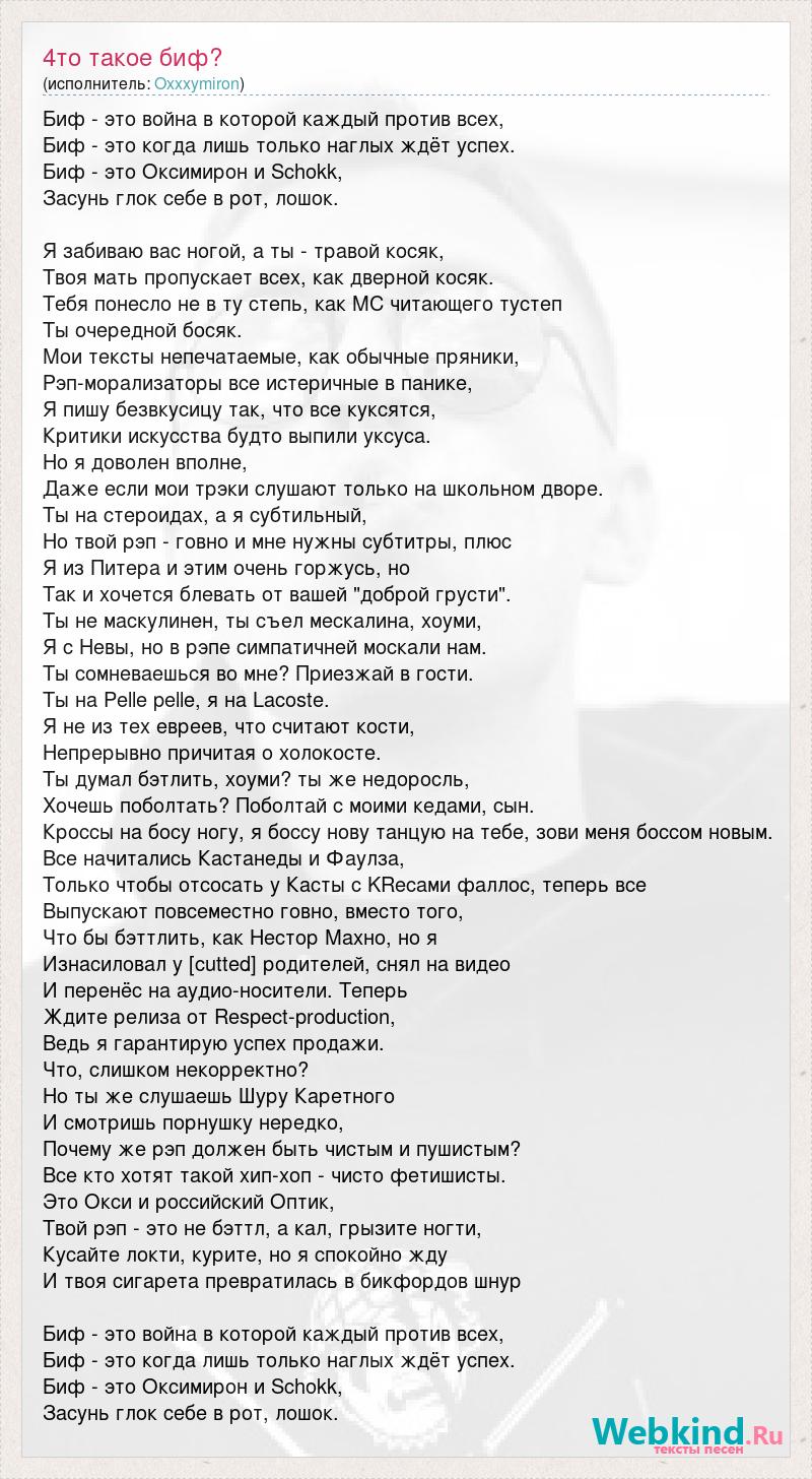 Биф - это война в которой каждый против всех, Биф - это когда лишь только наглых ждёт успех. Биф - это Оксимирон и Schokk, Засунь глок себе в рот, лошок. Я забиваю вас ногой, а ты - травой косяк, Твоя мать пропускает всех, как дверной косяк. Тебя понесло не в ту степь, как MC читающего тустеп Ты очередной босяк. Мои тексты непечатаемые, как обычные пряники, Рэп-морализаторы все истеричные в панике, Я пишу безвкусицу так, что все куксятся, Критики искусства будто выпили уксуса. Но я доволен вполне, Даже если мои трэки слушают только на школьном дворе. Ты на стероидах, а я субтильный, Но твой рэп - говно и мне нужны субтитры, плюс Я из Питера и этим очень горжусь, но Так и хочется блевать от вашей "доброй грусти". Ты не маскулинен, ты съел мескалина, хоуми, Я с Невы, но в рэпе симпатичней москали нам. Ты сомневаешься во мне? Приезжай в гости. Ты на Pelle pelle, я на Lacoste. Я не из тех евреев, что считают кости, Непрерывно причитая о холокосте. Ты думал бэтлить, хоуми? ты же недоросль, Хочешь поболтать? Поболтай с моими кедами, сын. Кроссы на босу ногу, я боссу нову танцую на тебе, зови меня боссом новым. Все начитались Кастанеды и Фаулза, Только чтобы отсосать у Касты с KRecами фаллос, теперь все Выпускают повсеместно говно, вместо того, Что бы бэттлить, как Нестор Махно, но я Изнасиловал у [cutted] родителей, снял на видео И перенёс на аудио-носители. Теперь Ждите релиза от Respect-production, Ведь я гарантирую успех продажи. Что, слишком некорректно? Но ты же слушаешь Шуру Каретного И смотришь порнушку нередко, Почему же рэп должен быть чистым и пушистым? Все кто хотят такой хип-хоп - чисто фетишисты. Это Окси и российский Оптик, Твой рэп - это не бэттл, а кал, грызите ногти, Кусайте локти, курите, но я спокойно жду И твоя сигарета превратилась в бикфордов шнур Биф - это война в которой каждый против всех, Биф - это когда лишь только наглых ждёт успех. Биф - это Оксимирон и Schokk, Засунь глок себе в рот, лошок.