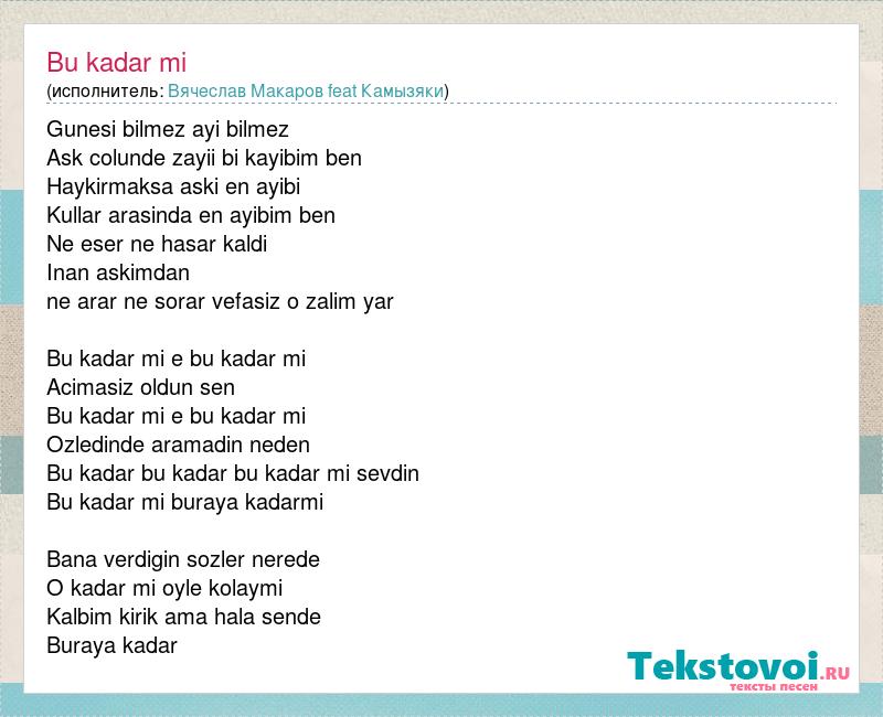 Gunesi bilmez ayi bilmez Ask colunde zayii bi kayibim ben Haykirmaksa aski en ayibi Kullar arasinda en ayibim ben Ne eser ne hasar kaldi Inan askimdan ne arar ne sorar vefasiz o zalim yar Bu kadar mi e bu kadar mi Acimasiz oldun sen Bu kadar mi e bu kadar mi Ozledinde aramadin neden Bu kadar bu kadar bu kadar mi sevdin Bu kadar mi buraya kadarmi Bana verdigin sozler nerede O kadar mi oyle kolaymi Kalbim kirik ama hala sende Buraya kadar