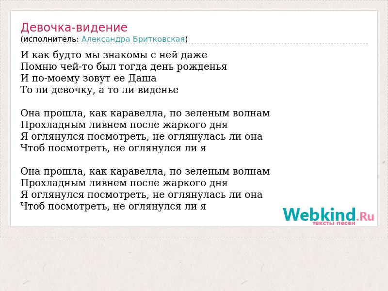 И как будто мы знакомы с ней даже Помню чей-то был тогда день рожденья И по-моему зовут ее Даша То ли девочку, а то ли виденье Она прошла, как каравелла, по зеленым волнам Прохладным ливнем после жаркого дня Я оглянулся посмотреть, не оглянулась ли она Чтоб посмотреть, не оглянулся ли я Она прошла, как каравелла, по зеленым волнам Прохладным ливнем после жаркого дня Я оглянулся посмотреть, не оглянулась ли она Чтоб посмотреть, не оглянулся ли я