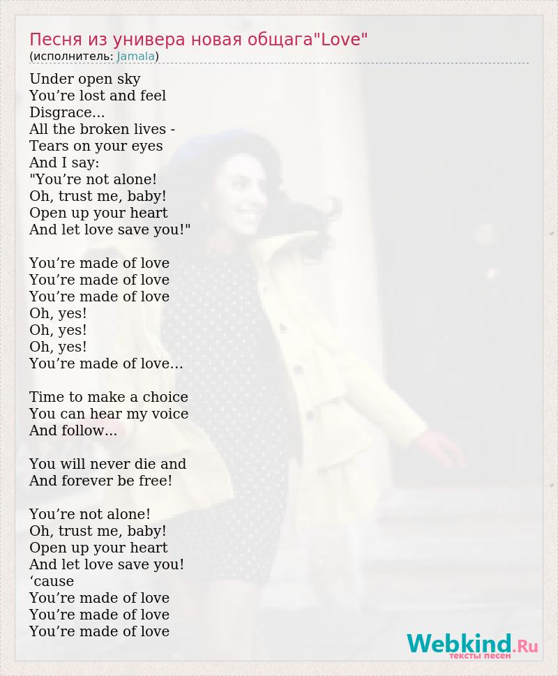 Under open sky You’re lost and feel Disgrace... All the broken lives - Tears on your eyes And I say: "You’re not alone! Oh, trust me, baby! Open up your heart And let love save you!" You’re made of love You’re made of love You’re made of love Oh, yes! Oh, yes! Oh, yes! You’re made of love… Time to make a choice You can hear my voice And follow... You will never die and And forever be free! You’re not alone! Oh, trust me, baby! Open up your heart And let love save you! ‘cause You’re made of love You’re made of love You’re made of love