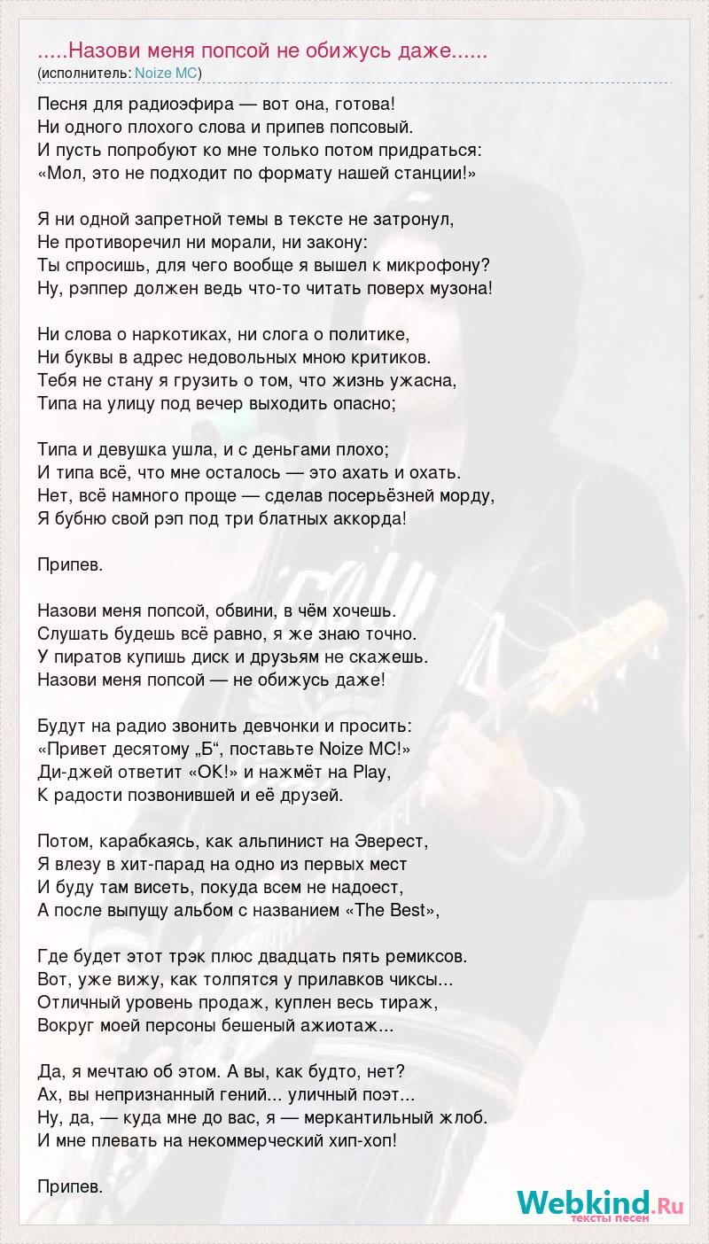 Песня для радиоэфира — вот она, готова! Ни одного плохого слова и припев попсовый. И пусть попробуют ко мне только потом придраться: «Мол, это не подходит по формату нашей станции!» Я ни одной запретной темы в тексте не затронул, Не противоречил ни морали, ни закону: Ты спросишь, для чего вообще я вышел к микрофону? Ну, рэппер должен ведь что-то читать поверх музона! Ни слова о наркотиках, ни слога о политике, Ни буквы в адрес недовольных мною критиков. Тебя не стану я грузить о том, что жизнь ужасна, Типа на улицу под вечер выходить опасно; Типа и девушка ушла, и с деньгами плохо; И типа всё, что мне осталось — это ахать и охать. Нет, всё намного проще — сделав посерьёзней морду, Я бубню свой рэп под три блатных аккорда! Припев. Назови меня попсой, обвини, в чём хочешь. Слушать будешь всё равно, я же знаю точно. У пиратов купишь диск и друзьям не скажешь. Назови меня попсой — не обижусь даже! Будут на радио звонить девчонки и просить: «Привет десятому „Б“, поставьте Noize MC!» Ди-джей ответит «ОК!» и нажмёт на Play, К радости позвонившей и её друзей. Потом, карабкаясь, как альпинист на Эверест, Я влезу в хит-парад на одно из первых мест И буду там висеть, покуда всем не надоест, А после выпущу альбом с названием «The Best», Где будет этот трэк плюс двадцать пять ремиксов. Вот, уже вижу, как толпятся у прилавков чиксы... Отличный уровень продаж, куплен весь тираж, Вокруг моей персоны бешеный ажиотаж... Да, я мечтаю об этом. А вы, как будто, нет? Ах, вы непризнанный гений... уличный поэт... Ну, да, — куда мне до вас, я — меркантильный жлоб. И мне плевать на некоммерческий хип-хоп! Припев.