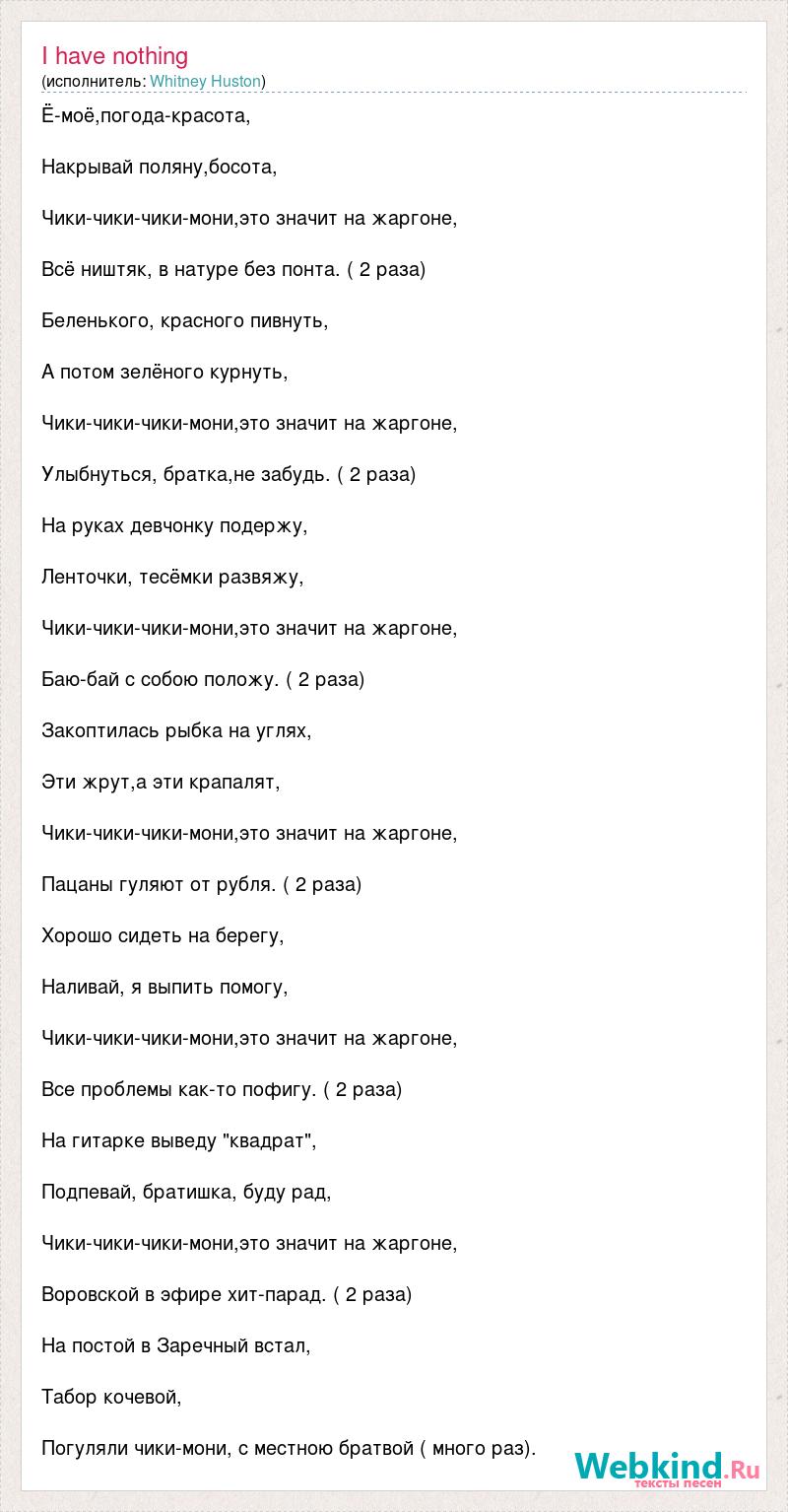 Ё-моё,погода-красота, Накрывай поляну,босота, Чики-чики-чики-мони,это значит на жаргоне, Всё ништяк, в натуре без понта. ( 2 раза) Беленького, красного пивнуть, А потом зелёного курнуть, Чики-чики-чики-мони,это значит на жаргоне, Улыбнуться, братка,не забудь. ( 2 раза) На руках девчонку подержу, Ленточки, тесёмки развяжу, Чики-чики-чики-мони,это значит на жаргоне, Баю-бай с собою положу. ( 2 раза) Закоптилась рыбка на углях, Эти жрут,а эти крапалят, Чики-чики-чики-мони,это значит на жаргоне, Пацаны гуляют от рубля. ( 2 раза) Хорошо сидеть на берегу, Наливай, я выпить помогу, Чики-чики-чики-мони,это значит на жаргоне, Все проблемы как-то пофигу. ( 2 раза) На гитарке выведу "квадрат", Подпевай, братишка, буду рад, Чики-чики-чики-мони,это значит на жаргоне, Воровской в эфире хит-парад. ( 2 раза) На постой в Заречный встал, Табор кочевой, Погуляли чики-мони, с местною братвой ( много раз).