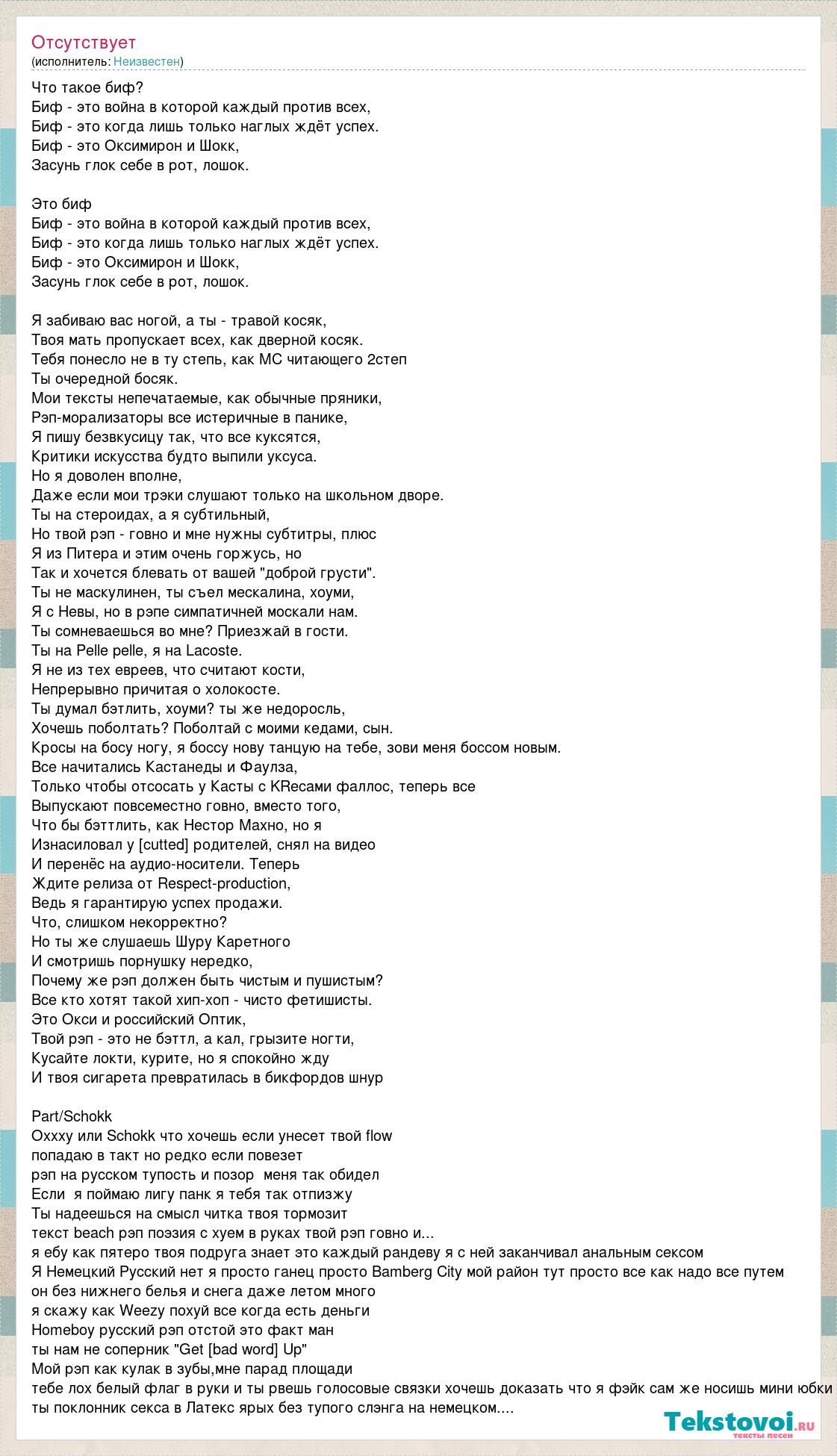 Что такое биф? Биф - это война в которой каждый против всех, Биф - это когда лишь только наглых ждёт успех. Биф - это Оксимирон и Шокк, Засунь глок себе в рот, лошок. Это биф Биф - это война в которой каждый против всех, Биф - это когда лишь только наглых ждёт успех. Биф - это Оксимирон и Шокк, Засунь глок себе в рот, лошок. Я забиваю вас ногой, а ты - травой косяк, Твоя мать пропускает всех, как дверной косяк. Тебя понесло не в ту степь, как MC читающего 2степ Ты очередной босяк. Мои тексты непечатаемые, как обычные пряники, Рэп-морализаторы все истеричные в панике, Я пишу безвкусицу так, что все куксятся, Критики искусства будто выпили уксуса. Но я доволен вполне, Даже если мои трэки слушают только на школьном дворе. Ты на стероидах, а я субтильный, Но твой рэп - говно и мне нужны субтитры, плюс Я из Питера и этим очень горжусь, но Так и хочется блевать от вашей "доброй грусти". Ты не маскулинен, ты съел мескалина, хоуми, Я с Невы, но в рэпе симпатичней москали нам. Ты сомневаешься во мне? Приезжай в гости. Ты на Pelle pelle, я на Lacoste. Я не из тех евреев, что считают кости, Непрерывно причитая о холокосте. Ты думал бэтлить, хоуми? ты же недоросль, Хочешь поболтать? Поболтай с моими кедами, сын. Кросы на босу ногу, я боссу нову танцую на тебе, зови меня боссом новым. Все начитались Кастанеды и Фаулза, Только чтобы отсосать у Касты с KRecами фаллос, теперь все Выпускают повсеместно говно, вместо того, Что бы бэттлить, как Нестор Махно, но я Изнасиловал у [cutted] родителей, снял на видео И перенёс на аудио-носители. Теперь Ждите релиза от Respect-production, Ведь я гарантирую успех продажи. Что, слишком некорректно? Но ты же слушаешь Шуру Каретного И смотришь порнушку нередко, Почему же рэп должен быть чистым и пушистым? Все кто хотят такой хип-хоп - чисто фетишисты. Это Окси и российский Оптик, Твой рэп - это не бэттл, а кал, грызите ногти, Кусайте локти, курите, но я спокойно жду И твоя сигарета превратилась в бикфордов шнур Part/Schokk Oxxxy или Schokk что хочешь если унесет твой flow попадаю в такт но редко если повезет рэп на русском тупость и позор меня так обидел Если я поймаю лигу панк я тебя так отпизжу Ты надеешься на смысл читка твоя тормозит текст beach рэп поэзия с хуем в руках твой рэп говно и... я ебу как пятеро твоя подруга знает это каждый рандеву я с ней заканчивал анальным сексом Я Немецкий Русский нет я просто ганец просто Bamberg City мой район тут просто все как надо все путем он без нижнего белья и снега даже летом много я скажу как Weezy похуй все когда есть деньги Homeboy русский рэп отстой это факт ман ты нам не соперник "Get [bad word] Up" Мой рэп как кулак в зубы,мне парад площади тебе лох белый флаг в руки и ты рвешь голосовые связки хочешь доказать что я фэйк сам же носишь мини юбки ты поклонник секса в Латекс ярых без тупого слэнга на немецком....