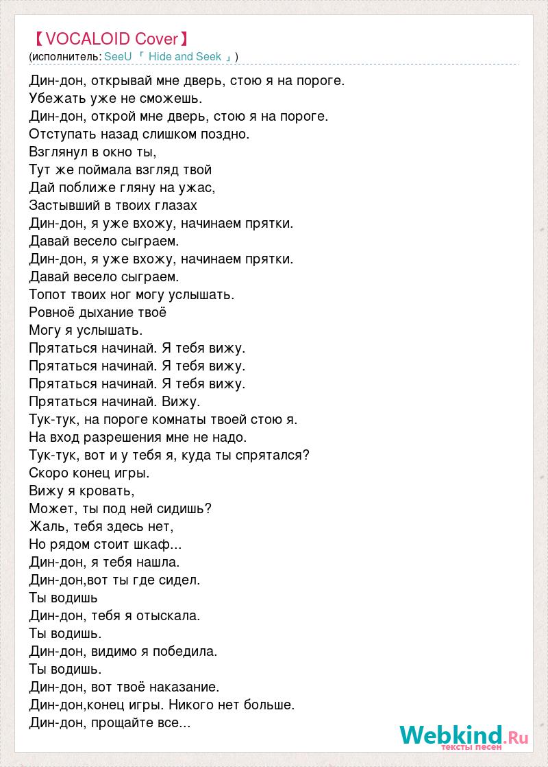 Дин-дон, открывай мне дверь, стою я на пороге. Убежать уже не сможешь. Дин-дон, открой мне дверь, стою я на пороге. Отступать назад слишком поздно. Взглянул в окно ты, Тут же поймала взгляд твой Дай поближе гляну на ужас, Застывший в твоих глазах Дин-дон, я уже вхожу, начинаем прятки. Давай весело сыграем. Дин-дон, я уже вхожу, начинаем прятки. Давай весело сыграем. Топот твоих ног могу услышать. Ровноё дыхание твоё Могу я услышать. Прятаться начинай. Я тебя вижу. Прятаться начинай. Я тебя вижу. Прятаться начинай. Я тебя вижу. Прятаться начинай. Вижу. Тук-тук, на пороге комнаты твоей стою я. На вход разрешения мне не надо. Тук-тук, вот и у тебя я, куда ты спрятался? Скоро конец игры. Вижу я кровать, Может, ты под ней сидишь? Жаль, тебя здесь нет, Но рядом стоит шкаф... Дин-дон, я тебя нашла. Дин-дон,вот ты где сидел. Ты водишь Дин-дон, тебя я отыскала. Ты водишь. Дин-дон, видимо я победила. Ты водишь. Дин-дон, вот твоё наказание. Дин-дон,конец игры. Никого нет больше. Дин-дон, прощайте все...
