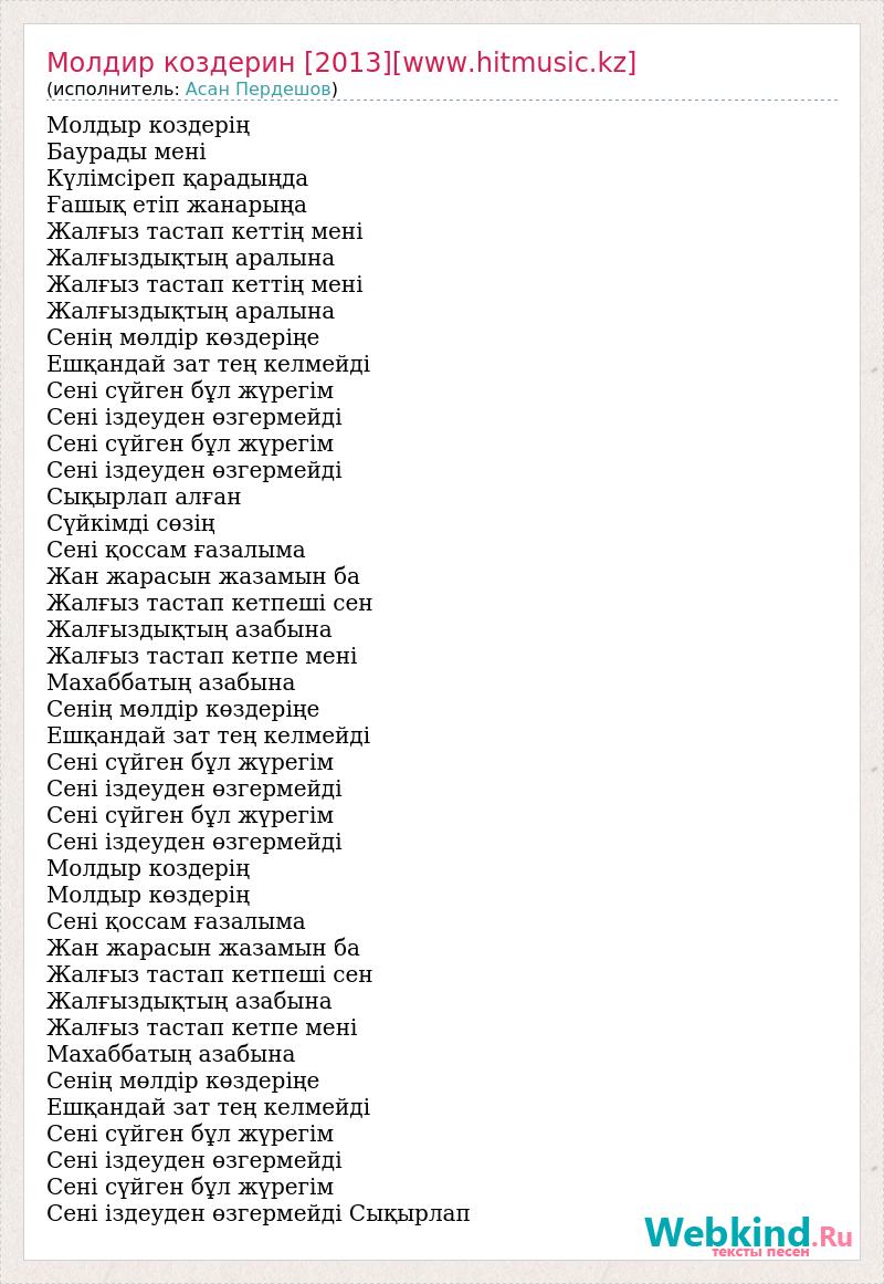 Молдыр коздерің Баурады мені Күлімсіреп қарадыңда Ғашық етіп жанарыңа Жалғыз тастап кеттің мені Жалғыздықтың аралына Жалғыз тастап кеттің мені Жалғыздықтың аралына Сенің мөлдір көздеріңе Ешқандай зат тең келмейді Сені сүйген бұл жүрегім Сені іздеуден өзгермейді Сені сүйген бұл жүрегім Сені іздеуден өзгермейді Сықырлап алған Сүйкімді сөзің Сені қоссам ғазалыма Жан жарасын жазамын ба Жалғыз тастап кетпеші сен Жалғыздықтың азабына Жалғыз тастап кетпе мені Махаббатың азабына Сенің мөлдір көздеріңе Ешқандай зат тең келмейді Сені сүйген бұл жүрегім Сені іздеуден өзгермейді Сені сүйген бұл жүрегім Сені іздеуден өзгермейді Молдыр коздерің Молдыр көздерің Сені қоссам ғазалыма Жан жарасын жазамын ба Жалғыз тастап кетпеші сен Жалғыздықтың азабына Жалғыз тастап кетпе мені Махаббатың азабына Сенің мөлдір көздеріңе Ешқандай зат тең келмейді Сені сүйген бұл жүрегім Сені іздеуден өзгермейді Сені сүйген бұл жүрегім Сені іздеуден өзгермейді Сықырлап
