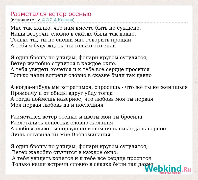 Мне так жалко, что нам вместе быть не суждено. Наши встречи, словно в сказке были так давно. Только ты, ты не спеши мне говорить прощай, А тебя я буду ждать, ты только это знай Я один брошу по улицам, фонари кругом сутулятся, Ветер жалобно стучится в каждое окно. А тебя увидеть хочется и к тебе все сердце просится Только наши встречи словно в сказке были так давно А когда-нибудь мы встретимся, спросишь - что же ты не женишься Промолчу и от обиды вдруг уйду тогда А тогда поймешь наверное, что любовь моя ты первая Моя первая любовь да и последняя Разметался ветер осенью и цветы мои ты бросила Разлетались лепестки словно желания А любовь свою ты первую не вспомнишь никогда наверное Лишь оставила ты мне Воспоминания Я один брошу по улицам, фонари кругом сутулятся, Ветер жалобно стучится в каждое окно. А тебя увидеть хочется и к тебе все сердце просится Только наши встречи словно в сказке были так давно