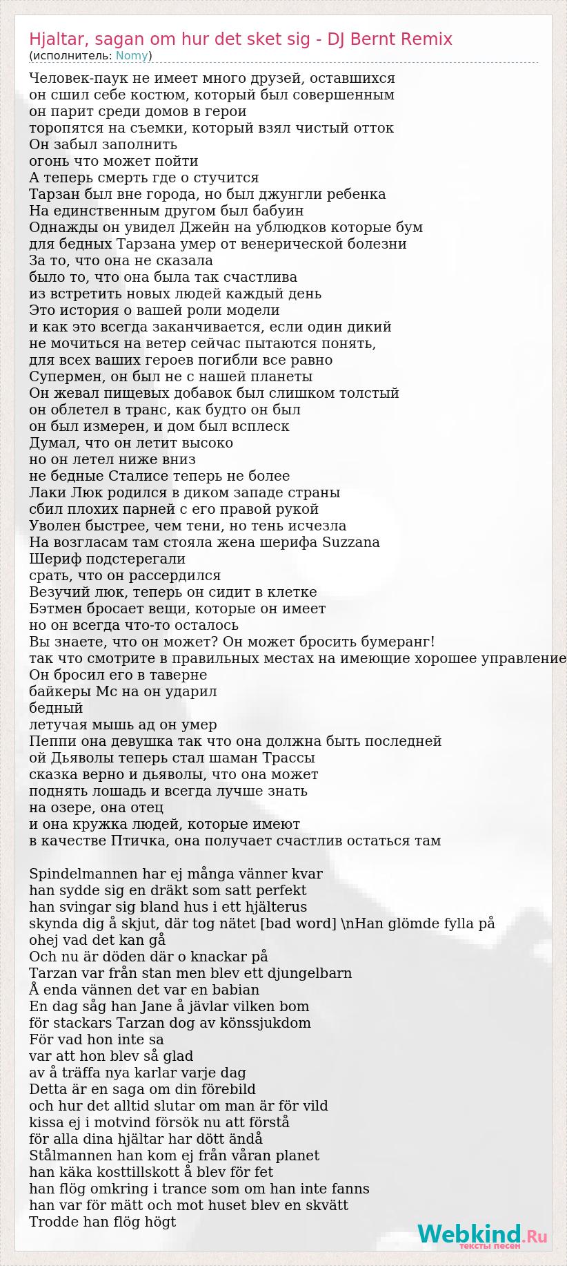 Человек-паук не имеет много друзей, оставшихся он сшил себе костюм, который был совершенным он парит среди домов в герои торопятся на съемки, который взял чистый отток Он забыл заполнить огонь что может пойти А теперь смерть где о стучится Тарзан был вне города, но был джунгли ребенка На единственным другом был бабуин Однажды он увидел Джейн на ублюдков которые бум для бедных Тарзана умер от венерической болезни За то, что она не сказала было то, что она была так счастлива из встретить новых людей каждый день Это история о вашей роли модели и как это всегда заканчивается, если один дикий не мочиться на ветер сейчас пытаются понять, для всех ваших героев погибли все равно Супермен, он был не с нашей планеты Он жевал пищевых добавок был слишком толстый он облетел в транс, как будто он был он был измерен, и дом был всплеск Думал, что он летит высоко но он летел ниже вниз не бедные Сталисе теперь не более Лаки Люк родился в диком западе страны сбил плохих парней с его правой рукой Уволен быстрее, чем тени, но тень исчезла На возгласам там стояла жена шерифа Suzzanа Шериф подстерегали срать, что он рассердился Везучий люк, теперь он сидит в клетке Бэтмен бросает вещи, которые он имеет но он всегда что-то осталось Вы знаете, что он может? Он может бросить бумеранг! так что смотрите в правильных местах на имеющие хорошее управление Он бросил его в таверне байкеры Mc на он ударил бедный летучая мышь ад он умер Пеппи она девушка так что она должна быть последней ой Дьяволы теперь стал шаман Трассы сказка верно и дьяволы, что она может поднять лошадь и всегда лучше знать на озере, она отец и она кружка людей, которые имеют в качестве Птичка, она получает счастлив остаться там Spindelmannen har ej många vänner kvar han sydde sig en dräkt som satt perfekt han svingar sig bland hus i ett hjälterus skynda dig å skjut, där tog nätet [bad word] \nHan glömde fylla på ohej vad det kan gå Och nu är döden där o knackar på Tarzan var från stan men blev ett djungelbarn Å enda vännen det var en babian En dag såg han Jane å jävlar vilken bom för stackars Tarzan dog av könssjukdom För vad hon inte sa var att hon blev så glad av å träffa nya karlar varje dag Detta är en saga om din förebild och hur det alltid slutar om man är för vild kissa ej i motvind försök nu att förstå för alla dina hjältar har dött ändå Stålmannen han kom ej från våran planet han käka kosttillskott å blev för fet han flög omkring i trance som om han inte fanns han var för mätt och mot huset blev en skvätt Trodde han flög högt