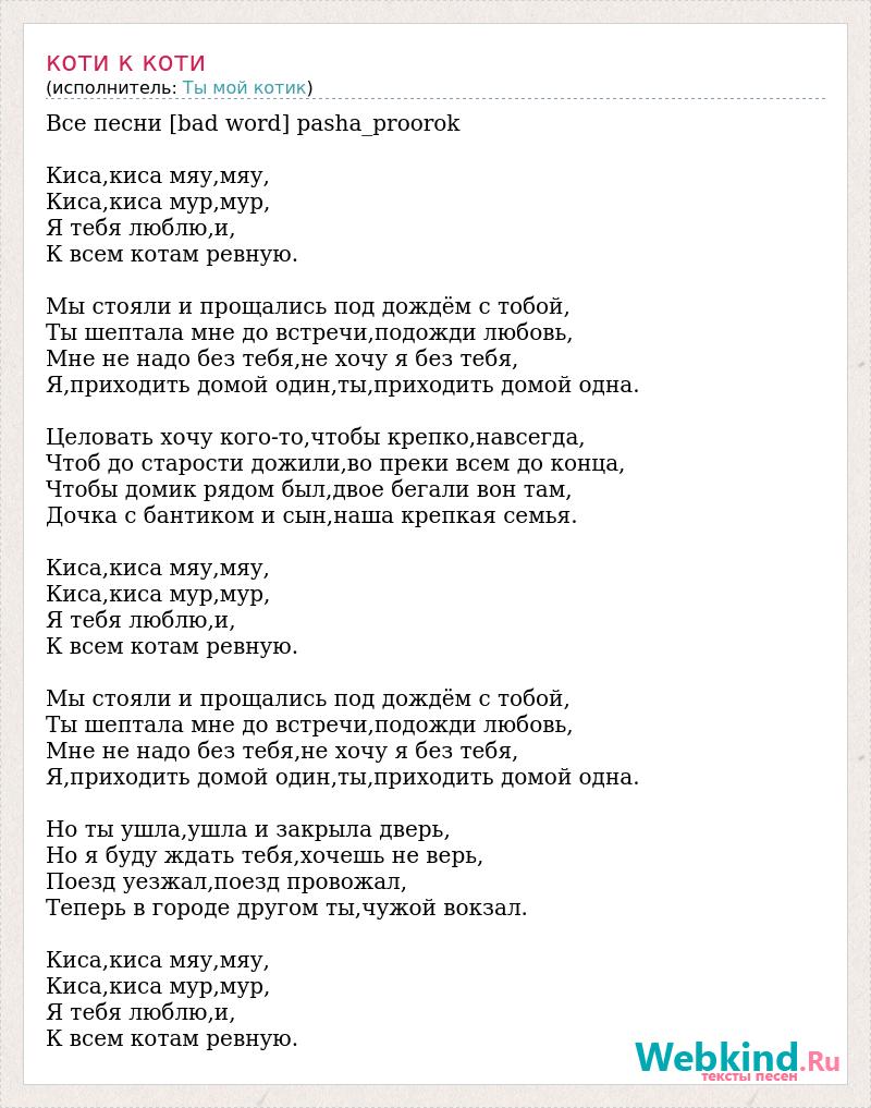 Все песни [bad word] pasha_proorok Киса,киса мяу,мяу, Киса,киса мур,мур, Я тебя люблю,и, К всем котам ревную. Мы стояли и прощались под дождём с тобой, Ты шептала мне до встречи,подожди любовь, Мне не надо без тебя,не хочу я без тебя, Я,приходить домой один,ты,приходить домой одна. Целовать хочу кого-то,чтобы крепко,навсегда, Чтоб до старости дожили,во преки всем до конца, Чтобы домик рядом был,двое бегали вон там, Дочка с бантиком и сын,наша крепкая семья. Киса,киса мяу,мяу, Киса,киса мур,мур, Я тебя люблю,и, К всем котам ревную. Мы стояли и прощались под дождём с тобой, Ты шептала мне до встречи,подожди любовь, Мне не надо без тебя,не хочу я без тебя, Я,приходить домой один,ты,приходить домой одна. Но ты ушла,ушла и закрыла дверь, Но я буду ждать тебя,хочешь не верь, Поезд уезжал,поезд провожал, Теперь в городе другом ты,чужой вокзал. Киса,киса мяу,мяу, Киса,киса мур,мур, Я тебя люблю,и, К всем котам ревную.