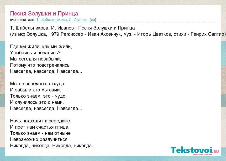 Т. Шабельникова, И. Иванов - Песня Золушки и Принца (из мф Золушка, 1979 Режиссер - Иван Аксенчук, муз. - Игорь Цветков, стихи - Генрих Сапгир) Где мы жили, как мы жили, Улыбаясь и печалясь? Мы сегодня позабыли, Потому что повстречались Навсегда, навсегда, Навсегда... Мы не знаем кто откуда И забыли кто мы сами. Только знаем, это - чудо. И случилось это с нами. Навсегда, навсегда, Навсегда... Ночь подходит к середине И поет нам счастья птица. Только знаем - нам отныне Невозможно разлучиться Никогда, никогда, Никогда, никогда...