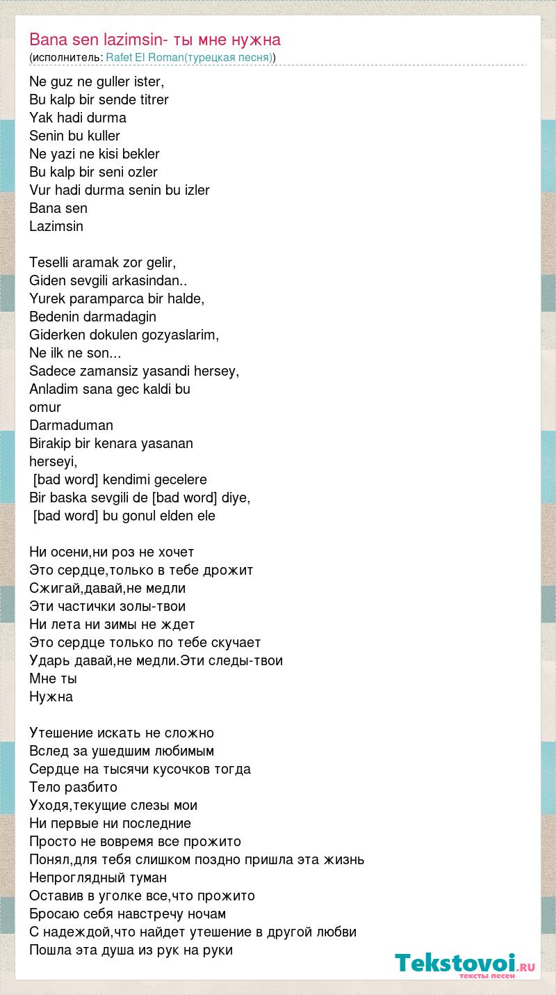 Ne guz ne guller ister, Bu kalp bir sende titrer Yak hadi durma Senin bu kuller Ne yazi ne kisi bekler Bu kalp bir seni ozler Vur hadi durma senin bu izler Bana sen Lazimsin Teselli aramak zor gelir, Giden sevgili arkasindan.. Yurek paramparca bir halde, Bedenin darmadagin Giderken dokulen gozyaslarim, Ne ilk ne son... Sadece zamansiz yasandi hersey, Anladim sana gec kaldi bu omur Darmaduman Birakip bir kenara yasanan herseyi, [bad word] kendimi gecelere Bir baska sevgili de [bad word] diye, [bad word] bu gonul elden ele Ни осени,ни роз не хочет Это сердце,только в тебе дрожит Сжигай,давай,не медли Эти частички золы-твои Ни лета ни зимы не ждет Это сердце только по тебе скучает Ударь давай,не медли.Эти следы-твои Мне ты Нужна Утешение искать не сложно Вслед за ушедшим любимым Сердце на тысячи кусочков тогда Тело разбито Уходя,текущие слезы мои Ни первые ни последние Просто не вовремя все прожито Понял,для тебя слишком поздно пришла эта жизнь Непроглядный туман Оставив в уголке все,что прожито Бросаю себя навстречу ночам С надеждой,что найдет утешение в другой любви Пошла эта душа из рук на руки