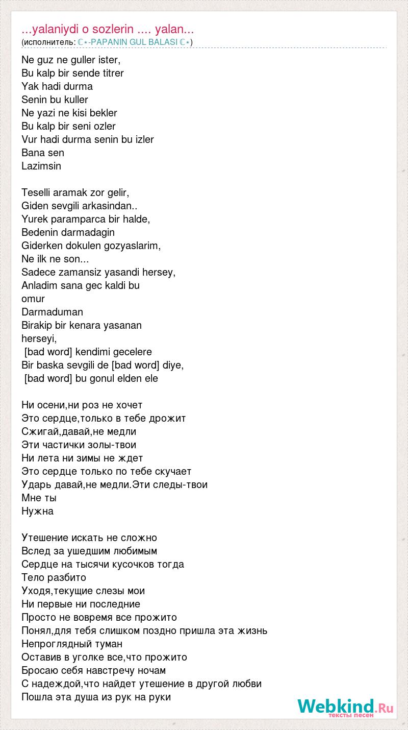 Ne guz ne guller ister, Bu kalp bir sende titrer Yak hadi durma Senin bu kuller Ne yazi ne kisi bekler Bu kalp bir seni ozler Vur hadi durma senin bu izler Bana sen Lazimsin Teselli aramak zor gelir, Giden sevgili arkasindan.. Yurek paramparca bir halde, Bedenin darmadagin Giderken dokulen gozyaslarim, Ne ilk ne son... Sadece zamansiz yasandi hersey, Anladim sana gec kaldi bu omur Darmaduman Birakip bir kenara yasanan herseyi, [bad word] kendimi gecelere Bir baska sevgili de [bad word] diye, [bad word] bu gonul elden ele Ни осени,ни роз не хочет Это сердце,только в тебе дрожит Сжигай,давай,не медли Эти частички золы-твои Ни лета ни зимы не ждет Это сердце только по тебе скучает Ударь давай,не медли.Эти следы-твои Мне ты Нужна Утешение искать не сложно Вслед за ушедшим любимым Сердце на тысячи кусочков тогда Тело разбито Уходя,текущие слезы мои Ни первые ни последние Просто не вовремя все прожито Понял,для тебя слишком поздно пришла эта жизнь Непроглядный туман Оставив в уголке все,что прожито Бросаю себя навстречу ночам С надеждой,что найдет утешение в другой любви Пошла эта душа из рук на руки