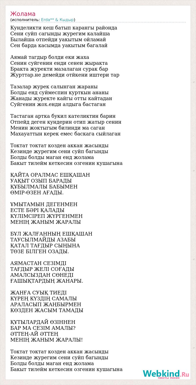 Кунделикти кеш батып карангы районда Сени суйп сагынды журегим калайша Былайша отпейди уакытым ойламай Сен барда касымда уакытым багалай Аямай тагдыр болди еки жаха Сенин суйгенин енди сенен жыракта Бракта журекти мазалаган сурак бар Журттар.не демейди отйкени иштери тар Тазалар журек салынган жараны Болды енд суймеспин курткын ананы Жанады журекте кайгы отты кайтадан Суйгенин жох.енди алдыга бастаган Тастаган артка букил кателиктин барин Отпейд деген кундерин отип жатыр сенин Менин жоктыгым билинди ма саган Махауаттын керек емес баскага сыйлаган Токтат токтат козден аккан жасынды Кезинде журегим сени суйп багынды Болды болды маган енд жолама Бакыт тилейм кеткесин озгенин кушагына ҚАЙТА ОРАЛМАС ЕШҚАШАН УАҚЫТ ОЗЫП БАРАДЫ ҚҰБЫЛМАЛЫ БАБЫМЕН ӨМІР-ӨЗЕН АҒАДЫ. ҰМЫТАМЫН ДЕГЕНМЕН ЕСТЕ БӘРІ ҚАЛАДЫ КҮЛІМСІРЕП ЖҮРГЕНМЕН МЕНІҢ ЖАНЫМ ЖАРАЛЫ БҰЛ ЖАЛҒАННЫҢ ЕШҚАШАН ТАУСЫЛМАЙДЫ АЗАБЫ ҚАТАЛ ТАҒДЫР СЫҢЫНА ТӨЗЕ БІЛГЕН ОЗАДЫ. АЯМАСТАН СЕЗІМДІ ТАҒДЫР ЖЕЛІ СОҒАДЫ АМАЛСЫЗДАН СӨНЕДІ ҒАШЫҚТАРДЫҢ ЖАНАРЫ. ЖАНҒА СУЫҚ ТИЕДІ КҮРЕҢ КҮЗДІҢ САМАЛЫ АРАЛАСЫП ЖАҢБЫРМЕН КӨЗДЕН ЖАСЫМ ТАМАДЫ ҚҰТЫЛАРДАЙ ӨЗІННЕН БАР МА СЕЗІМ АМАЛЫ? ӘТТЕҢ-АЙ ӘТТЕҢ МЕНІҢ ЖАНЫМ ЖАРАЛЫ! Токтат токтат козден аккан жасынды Кезинде журегим сени суйп багынды Болды болды маган енд жолама Бакыт тилейм кеткесин озгенин кушагына