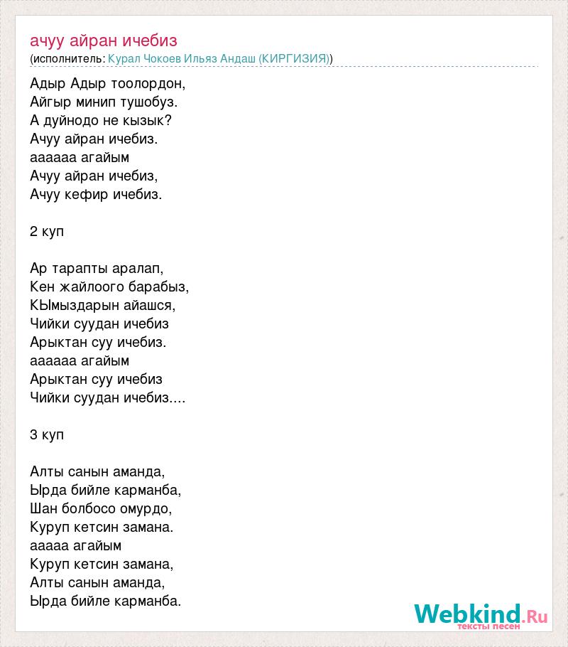 Адыр Адыр тоолордон, Айгыр минип тушобуз. А дуйнодо не кызык? Ачуу айран ичебиз. аааааа агайым Ачуу айран ичебиз, Ачуу кефир ичебиз. 2 куп Ар тарапты аралап, Кен жайлоого барабыз, КЫмыздарын айашся, Чийки суудан ичебиз Арыктан суу ичебиз. аааааа агайым Арыктан суу ичебиз Чийки суудан ичебиз.... 3 куп Алты санын аманда, Ырда бийле карманба, Шан болбосо омурдо, Куруп кетсин замана. ааааа агайым Куруп кетсин замана, Алты санын аманда, Ырда бийле карманба.