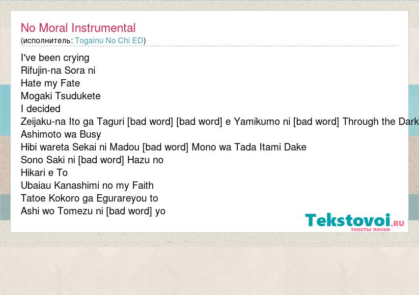 I've been crying Rifujin-na Sora ni Hate my Fate Mogaki Tsudukete I decided Zeijaku-na Ito ga Taguri Yoseru [bad word] e Yamikumo ni Hashiru Through the Dark Ashimoto wa Busy Hibi wareta Sekai ni Madou Shinjirareru Mono wa Tada Itami Dake Sono Saki ni Aru Hazu no Hikari e To Ubaiau Kanashimi no my Faith Tatoe Kokoro ga Egurareyou to Ashi wo Tomezu ni [bad word] yo