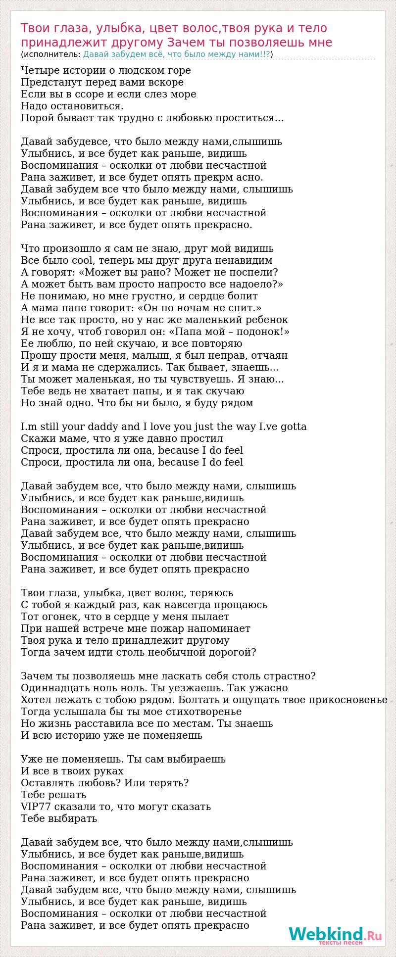 Четыре истории о людском горе Предстанут перед вами вскоре Если вы в ссоре и если слез море Надо остановиться. Порой бывает так трудно с любовью проститься... Давай забудевсе, что было между нами,слышишь Улыбнись, и все будет как раньше, видишь Воспоминания – осколки от любви несчастной Рана заживет, и все будет опять прекрм асно. Давай забудем все что было между нами, слышишь Улыбнись, и все будет как раньше, видишь Воспоминания – осколки от любви несчастной Рана заживет, и все будет опять прекрасно. Что произошло я сам не знаю, друг мой видишь Все было cool, теперь мы друг друга ненавидим А говорят: «Может вы рано? Может не поспели? А может быть вам просто напросто все надоело?» Не понимаю, но мне грустно, и сердце болит А мама папе говорит: «Он по ночам не спит.» Не все так просто, но у нас же маленький ребенок Я не хочу, чтоб говорил он: «Папа мой – подонок!» Ее люблю, по ней скучаю, и все повторяю Прошу прости меня, малыш, я был неправ, отчаян И я и мама не сдержались. Так бывает, знаешь... Ты может маленькая, но ты чувствуешь. Я знаю... Тебе ведь не хватает папы, и я так скучаю Но знай одно. Что бы ни было, я буду рядом I.m still your daddy and I love you just the way I.ve gotta Скажи маме, что я уже давно простил Спроси, простила ли она, because I do feel Спроси, простила ли она, because I do feel Давай забудем все, что было между нами, слышишь Улыбнись, и все будет как раньше,видишь Воспоминания – осколки от любви несчастной Рана заживет, и все будет опять прекрасно Давай забудем все, что было между нами, слышишь Улыбнись, и все будет как раньше,видишь Воспоминания – осколки от любви несчастной Рана заживет, и все будет опять прекрасно Твои глаза, улыбка, цвет волос, теряюсь С тобой я каждый раз, как навсегда прощаюсь Тот огонек, что в сердце у меня пылает При нашей встрече мне пожар напоминает Твоя рука и тело принадлежит другому Тогда зачем идти столь необычной дорогой? Зачем ты позволяешь мне ласкать себя столь страстно? Одиннадцать ноль ноль. Ты уезжаешь. Так ужасно Хотел лежать с тобою рядом. Болтать и ощущать твое прикосновенье Тогда услышала бы ты мое стихотворенье Но жизнь расставила все по местам. Ты знаешь И всю историю уже не поменяешь Уже не поменяешь. Ты сам выбираешь И все в твоих руках Оставлять любовь? Или терять? Тебе решать VIP77 сказали то, что могут сказать Тебе выбирать Давай забудем все, что было между нами,слышишь Улыбнись, и все будет как раньше,видишь Воспоминания – осколки от любви несчастной Рана заживет, и все будет опять прекрасно Давай забудем все, что было между нами, слышишь Улыбнись, и все будет как раньше, видишь Воспоминания – осколки от любви несчастной Рана заживет, и все будет опять прекрасно