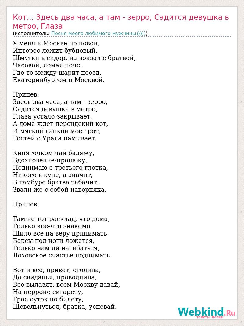Главная→Исполнители→Песня моего любимого мужчины)))))→Кот... Здесь два часа, а там - зерро, Садится девушка в метро, Глаза