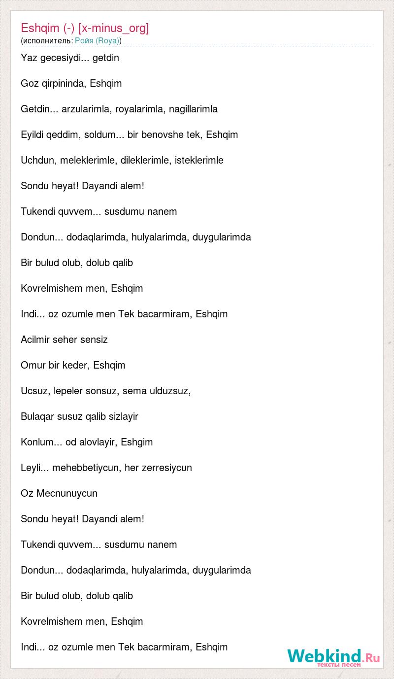 Yaz gecesiydi... getdin Goz qirpininda, Eshqim Getdin... arzularimla, royalarimla, nagillarimla Eyildi qeddim, soldum... bir benovshe tek, Eshqim Uchdun, meleklerimle, dileklerimle, isteklerimle Sondu heyat! Dayandi alem! Tukendi quvvem... susdumu nanem Dondun... dodaqlarimda, hulyalarimda, duygularimda Bir bulud olub, dolub qalib Kovrelmishem men, Eshqim Indi... oz ozumle men Tek bacarmiram, Eshqim Acilmir seher sensiz Omur bir keder, Eshqim Ucsuz, lepeler sonsuz, sema ulduzsuz, Bulaqar susuz qalib sizlayir Konlum... od alovlayir, Eshgim Leyli... mehebbetiycun, her zerresiycun Oz Mecnunuycun Sondu heyat! Dayandi alem! Tukendi quvvem... susdumu nanem Dondun... dodaqlarimda, hulyalarimda, duygularimda Bir bulud olub, dolub qalib Kovrelmishem men, Eshqim Indi... oz ozumle men Tek bacarmiram, Eshqim