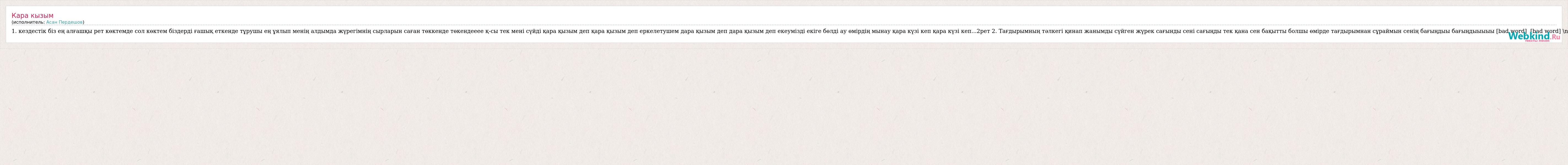 1. кездестік біз ең алғашқы рет көктемде сол көктем біздерді ғашық еткенде тұрушы ең ұялып менің алдымда жүрегімнің сырларын саған төккенде төкендееее қ-сы тек мені сүйді қара қызым деп қара қызым деп еркелетушем дара қызым деп дара қызым деп екеумізді екіге бөлді ау өмірдің мынау қара күзі кеп қара күзі кеп...2рет 2. Тағдырымның тәлкегі қинап жанымды сүйген жүрек сағынды сені сағыңды тек қана сен бақытты болшы өмірде тағдырымнан сұраймын сенің бағыңдыы бағыңдыыыыы [bad word] [bad word] \n
