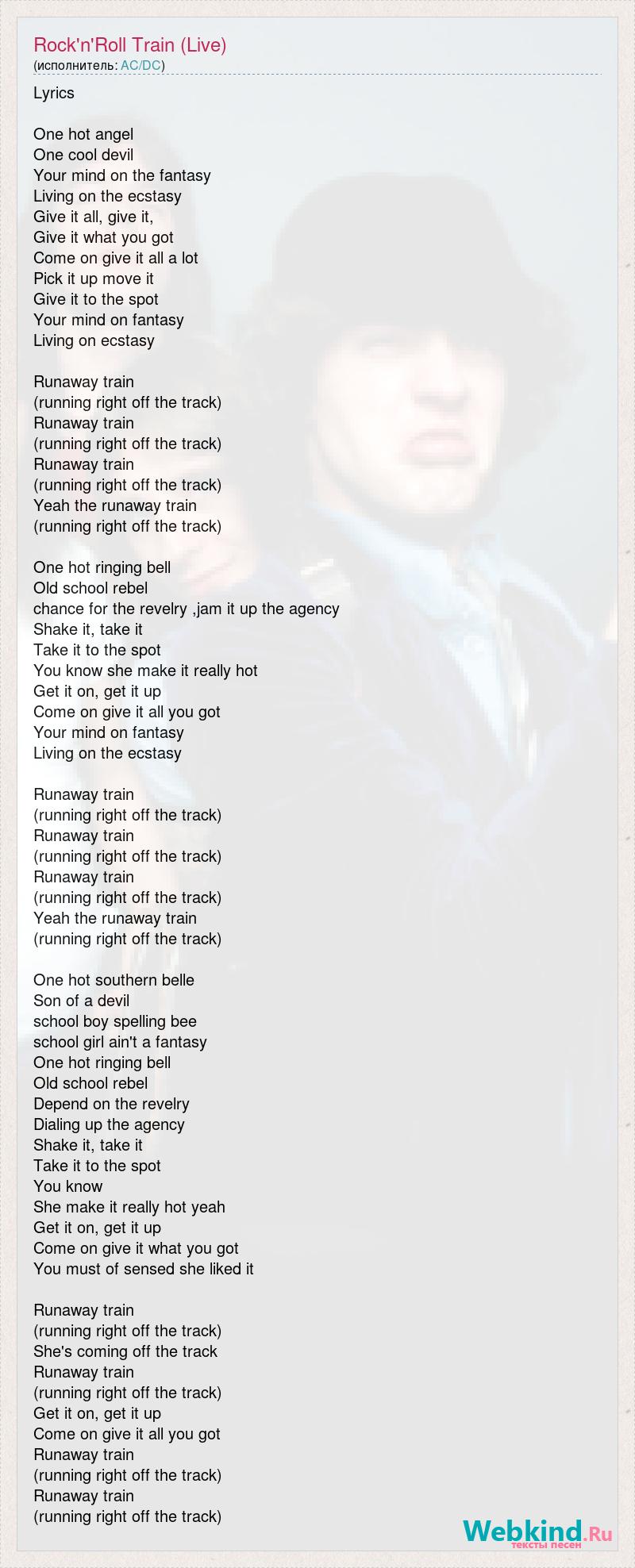 Lyrics One hot angel One cool devil Your mind on the fantasy Living on the ecstasy Give it all, give it, Give it what you got Come on give it all a lot Pick it up move it Give it to the spot Your mind on fantasy Living on ecstasy Runaway train (running right off the track) Runaway train (running right off the track) Runaway train (running right off the track) Yeah the runaway train (running right off the track) One hot ringing bell Old school rebel chance for the revelry ,jam it up the agency Shake it, take it Take it to the spot You know she make it really hot Get it on, get it up Come on give it all you got Your mind on fantasy Living on the ecstasy Runaway train (running right off the track) Runaway train (running right off the track) Runaway train (running right off the track) Yeah the runaway train (running right off the track) One hot southern belle Son of a devil school boy spelling bee school girl ain't a fantasy One hot ringing bell Old school rebel Depend on the revelry Dialing up the agency Shake it, take it Take it to the spot You know She make it really hot yeah Get it on, get it up Come on give it what you got You must of sensed she liked it Runaway train (running right off the track) She's coming off the track Runaway train (running right off the track) Get it on, get it up Come on give it all you got Runaway train (running right off the track) Runaway train (running right off the track)
