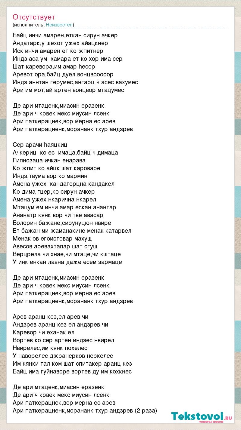 Байц инчи амарен,еткан сирун ачкер Андатарк,у шехот ужех айацкнер Иск инчи амарен ет ко жпитнер Индз аса ум хамара ет ко хор има сер Шат каревора,им амар hесор Аревот ора,байц дуел вонцвооооор Индз аннтан герумес,ангарц ч асес вахумес Ари им мот,ай артен вонцвор мтацумес Де ари мтаценк,миасин еразенк Де ари ч крвек мекс миусин лсенк Ари паткерацнек,вор мерна ес арев Ари паткерацненк,морананк тхур андзрев Сер арачи hаяцкиц Ачкериц ко ес имаца,байц ч димаца Гипнозаца ичкан енарава Ко жпит ко айцк шат кароваре Индз,твума вор ко мармин Амена ужех кандагорцна кандакел Ко дима гцер,ко сирун ачкер Амена ужех нкарична нкарел Мтацум ем инчи амар ескан анантар Ананатр кянк вор чи тве авасар Болорин бажане,сирунуцюн нвире Ет бажан ми жаманакине менак катарвел Менак ов егоистовар махущ Авесов аревахтапар шат сгуш Верцрела чи хнае,чи мтаце,чи кштаце У инк енкан лавна даже есем зармаце Де ари мтаценк,миасин еразенк Де ари ч крвек мекс миусин лсенк Ари паткерацнек,вор мерна ес арев Ари паткерацненк,морананк тхур андзрев Арев аранц кез,ел арев чи Андзрев аранц кез ел андзрев чи Каревор чи еханак ел Вортев ко сер артен индзес нвирел Нвирелес,им кянк похелес У наворелес джранерков неркелес Им кянки тал ком шат спитакер аранц кез Байц има гуйнаворе вортев ду им кохкнес Де ари мтаценк,миасин еразенк Де ари ч крвек мекс миусин лсенк Ари паткерацнек,вор мерна ес арев Ари паткерацненк,морананк тхур андзрев (2 раза)