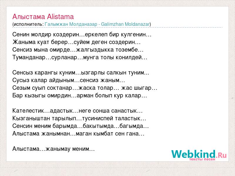 Сенин молдир коздерин…еркелеп бир кулгенин… Жаныма куат берер…суйем деген создерин… Сенсиз мына омирде…жалгыздыкка тозембе… Туманданар…сурланар…мунга толы конилдей… Сенсыз карангы куним…ызгарлы салкын туним... Сусыз калар айдыным…сенсиз жаным… Сезым суып соктанар…жаска толар… жас шыгар… Бар кызыгы омирдин…арман болып кур калар… Кателестик…адастык…неге сонша санастык… Кызганыштан тарылып…тусиниспей таластык… Сенсин меним барымда…бакытымда…багымда… Алыстама жанымнан…маган кымбат сен гана… Алыстама…жанымау меним…
