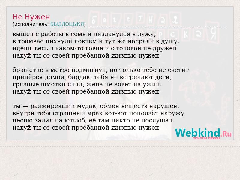 вышел с работы в семь и пизданулся в лужу, в трамвае пихнули локтём и тут же насрали в душу. идёшь весь в каком-то говне и с головой не дружен нахуй ты со своей проёбанной жизнью нужен. брюнетке в метро подмигнул, но только тебе не светит припёрся домой, бардак, тебя не встречают дети, грязные шмотки снял, жена не зовёт на ужин. нахуй ты со своей проёбанной жизнью нужен. ты — разжиревший мудак, обмен веществ нарушен, внутри тебя страшный мрак вот-вот поползёт наружу песню залил на ютьюб, её там никто не послушал. нахуй ты со своей проёбанной жизнью нужен.