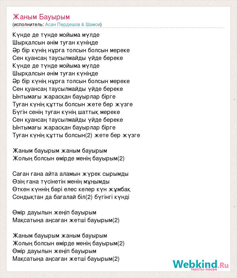 Күнде де түнде мойыма мүлде Шырқалсын әнім туған күніңде Әр бір күнің нұрға толсын болсын мереке Сен қуансаң таусылмайды үйде береке Күнде де түнде мойыма мүлде Шырқалсын әнім туған күніңде Әр бір күнің нұрға толсын болсын мереке Сен қуансаң таусылмайды үйде береке Ынтымағы жарасқан бауырлар бірге Туған күнің құтты болсын жете бер жүзге Бүгін сенің туған күнің шаттық мереке Сен қуансаң таусылмайды үйде береке Ынтымағы жарасқан бауырлар бірге Туған күнің құтты болсын(2) жете бер жүзге Жаным бауырым жаным бауырым Жолың болсын өмірде менің бауырым(2) Саған ғана айта аламын жүрек сырымды Өзің ғана түсінетін менің мұңымды Өткен күннің бәрі елес келер күн жұмбақ Сондықтан да бағалай біл(2) бүгінгі күнді Өмір дауылын жеңіп бауырым Мақсатыңа аңсаған жетші бауырым(2) Жаным бауырым жаным бауырым Жолың болсын өмірде менің бауырым(2) Өмір дауылын жеңіп бауырым Мақсатыңа аңсаған жетші бауырым(2)