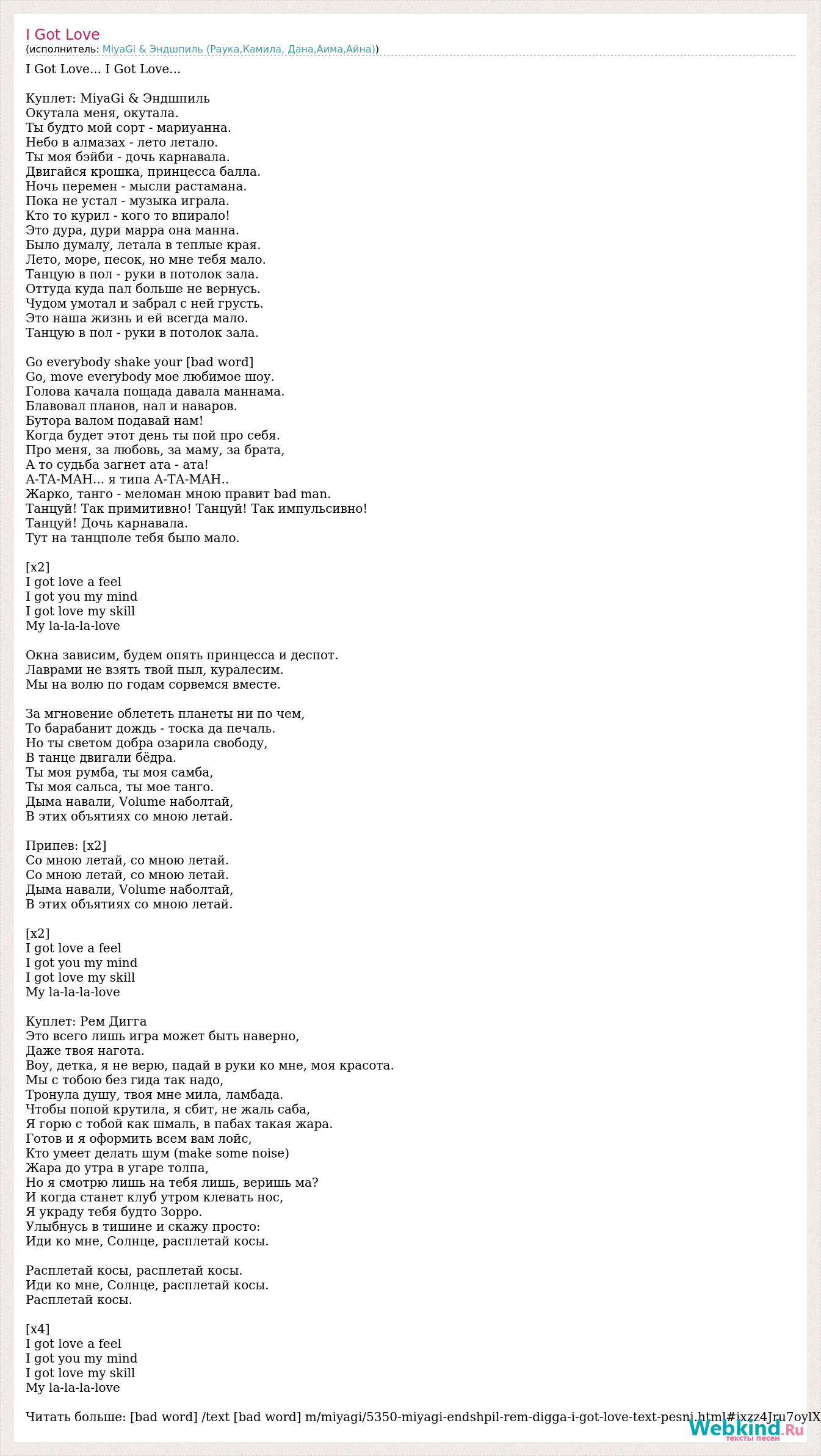 I Got Love... I Got Love... Куплет: MiyaGi & Эндшпиль Окутала меня, окутала. Ты будто мой сорт - мариуанна. Небо в алмазах - лето летало. Ты моя бэйби - дочь карнавала. Двигайся крошка, принцесса балла. Ночь перемен - мысли растамана. Пока не устал - музыка играла. Кто то курил - кого то впирало! Это дура, дури марра она манна. Было думалу, летала в теплые края. Лето, море, песок, но мне тебя мало. Танцую в пол - руки в потолок зала. Оттуда куда пал больше не вернусь. Чудом умотал и забрал с ней грусть. Это наша жизнь и ей всегда мало. Танцую в пол - руки в потолок зала. Go everybody shake your [bad word] Go, move everybody мое любимое шоу. Голова качала пощада давала маннама. Блавовал планов, нал и наваров. Бутора валом подавай нам! Когда будет этот день ты пой про себя. Про меня, за любовь, за маму, за брата, А то судьба загнет ата - ата! А-ТА-МАН... я типа А-ТА-МАН.. Жарко, танго - меломан мною правит bad man. Танцуй! Так примитивно! Танцуй! Так импульсивно! Танцуй! Дочь карнавала. Тут на танцполе тебя было мало. [x2] I got love a feel I got you my mind I got love my skill My la-la-la-love Окна зависим, будем опять принцесса и деспот. Лаврами не взять твой пыл, куралесим. Мы на волю по годам сорвемся вместе. За мгновение облететь планеты ни по чем, То барабанит дождь - тоска да печаль. Но ты светом добра озарила свободу, В танце двигали бёдра. Ты моя румба, ты моя самба, Ты моя сальса, ты мое танго. Дыма навали, Volume наболтай, В этих объятиях со мною летай. Припев: [х2] Со мною летай, со мною летай. Со мною летай, со мною летай. Дыма навали, Volume наболтай, В этих объятиях со мною летай. [х2] I got love a feel I got you my mind I got love my skill My la-la-la-love Куплет: Рем Дигга Это всего лишь игра может быть наверно, Даже твоя нагота. Воу, детка, я не верю, падай в руки ко мне, моя красота. Мы с тобою без гида так надо, Тронула душу, твоя мне мила, ламбада. Чтобы попой крутила, я сбит, не жаль саба, Я горю с тобой как шмаль, в пабах такая жара. Готов и я оформить всем вам лойс, Кто умеет делать шум (make some noise) Жара до утра в угаре толпа, Но я смотрю лишь на тебя лишь, веришь ма? И когда станет клуб утром клевать нос, Я украду тебя будто Зорро. Улыбнусь в тишине и скажу просто: Иди ко мне, Солнце, расплетай косы. Расплетай косы, расплетай косы. Иди ко мне, Солнце, расплетай косы. Расплетай косы. [x4] I got love a feel I got you my mind I got love my skill My la-la-la-love Читать больше: [bad word] /text [bad word] m/miyagi/5350-miyagi-endshpil-rem-digga-i-got-love-text-pesni.html#ixzz4Jru7oylX