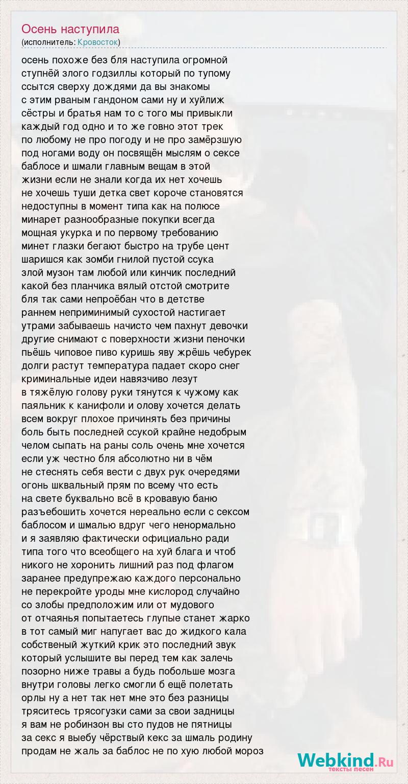 осень похоже без бля наступила огромной ступнёй злого годзиллы который по тупому ссытся сверху дождями да вы знакомы с этим рваным гандоном сами ну и хуйлиж сёстры и братья нам то с того мы привыкли каждый год одно и то же говно этот трек по любому не про погоду и не про замёрзшую под ногами воду он посвящён мыслям о сексе баблосе и шмали главным вещам в этой жизни если не знали когда их нет хочешь не хочешь туши детка свет короче становятся недоступны в момент типа как на полюсе минарет разнообразные покупки всегда мощная укурка и по первому требованию минет глазки бегают быстро на трубе цент шаришся как зомби гнилой пустой ссука злой музон там любой или кинчик последний какой без планчика вялый отстой смотрите бля так сами непроёбан что в детстве раннем неприминимый сухостой настигает утрами забываешь начисто чем пахнут девочки другие снимают с поверхности жизни пеночки пьёшь чиповое пиво куришь яву жрёшь чебурек долги растут температура падает скоро снег криминальные идеи навязчиво лезут в тяжёлую голову руки тянутся к чужому как паяльник к канифоли и олову хочется делать всем вокруг плохое причинять без причины боль быть последней ссукой крайне недобрым челом сыпать на раны соль очень мне хочется если уж честно бля абсолютно ни в чём не стеснять себя вести с двух рук очередями огонь шквальный прям по всему что есть на свете буквально всё в кровавую баню разъебошить хочется нереально если с сексом баблосом и шмалью вдруг чего ненормально и я заявляю фактически официально ради типа того что всеобщего на хуй блага и чтоб никого не хоронить лишний раз под флагом заранее предупрежаю каждого персонально не перекройте уроды мне кислород случайно со злобы предположим или от мудового от отчаянья попытаетесь глупые станет жарко в тот самый миг напугает вас до жидкого кала собственый жуткий крик это последний звук который услышите вы перед тем как залечь позорно ниже травы а будь побольше мозга внутри головы легко смогли б ещё полетать орлы ну а нет так нет мне это без разницы тряситесь трясогузки сами за свои задницы я вам не робинзон вы сто пудов не пятницы за секс я выебу чёрствый кекс за шмаль родину продам не жаль за баблос не по хую любой мороз