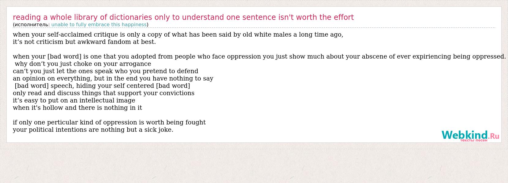 Главная→Исполнители→Unable to fully embrace this happiness→Reading a whole library of dictionaries only to understand one sentence