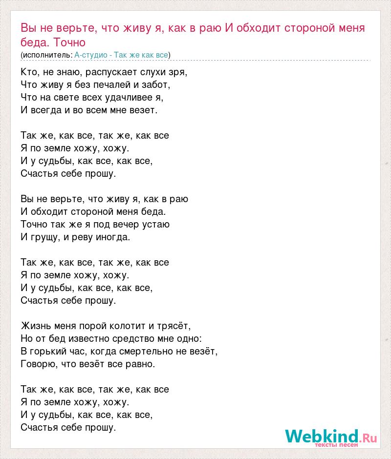 Кто, не знаю, распускает слухи зря, Что живу я без печалей и забот, Что на свете всех удачливее я, И всегда и во всем мне везет. Так же, как все, так же, как все Я по земле хожу, хожу. И у судьбы, как все, как все, Счастья себе прошу. Вы не верьте, что живу я, как в раю И обходит стороной меня беда. Точно так же я под вечер устаю И грущу, и реву иногда. Так же, как все, так же, как все Я по земле хожу, хожу. И у судьбы, как все, как все, Счастья себе прошу. Жизнь меня порой колотит и трясёт, Но от бед известно средство мне одно: В горький час, когда смертельно не везёт, Говорю, что везёт все равно. Так же, как все, так же, как все Я по земле хожу, хожу. И у судьбы, как все, как все, Счастья себе прошу.
