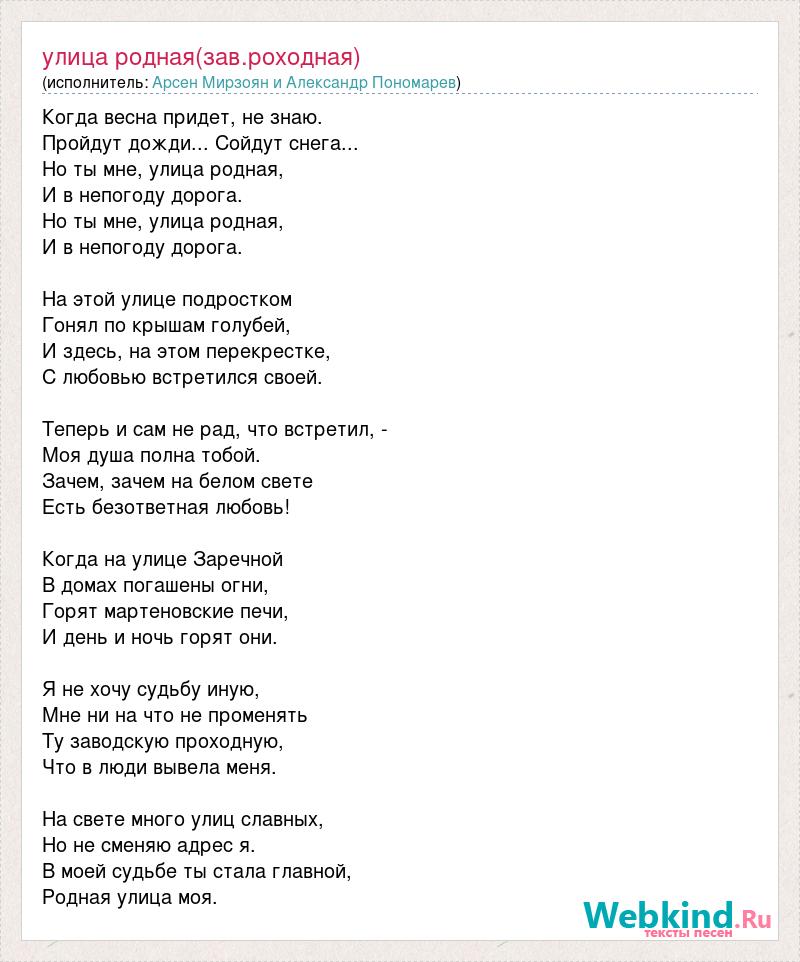 Когда весна придет, не знаю. Пройдут дожди... Сойдут снега... Но ты мне, улица родная, И в непогоду дорога. Но ты мне, улица родная, И в непогоду дорога. На этой улице подростком Гонял по крышам голубей, И здесь, на этом перекрестке, С любовью встретился своей. Теперь и сам не рад, что встретил, - Моя душа полна тобой. Зачем, зачем на белом свете Есть безответная любовь! Когда на улице Заречной В домах погашены огни, Горят мартеновские печи, И день и ночь горят они. Я не хочу судьбу иную, Мне ни на что не променять Ту заводскую проходную, Что в люди вывела меня. На свете много улиц славных, Но не сменяю адрес я. В моей судьбе ты стала главной, Родная улица моя.