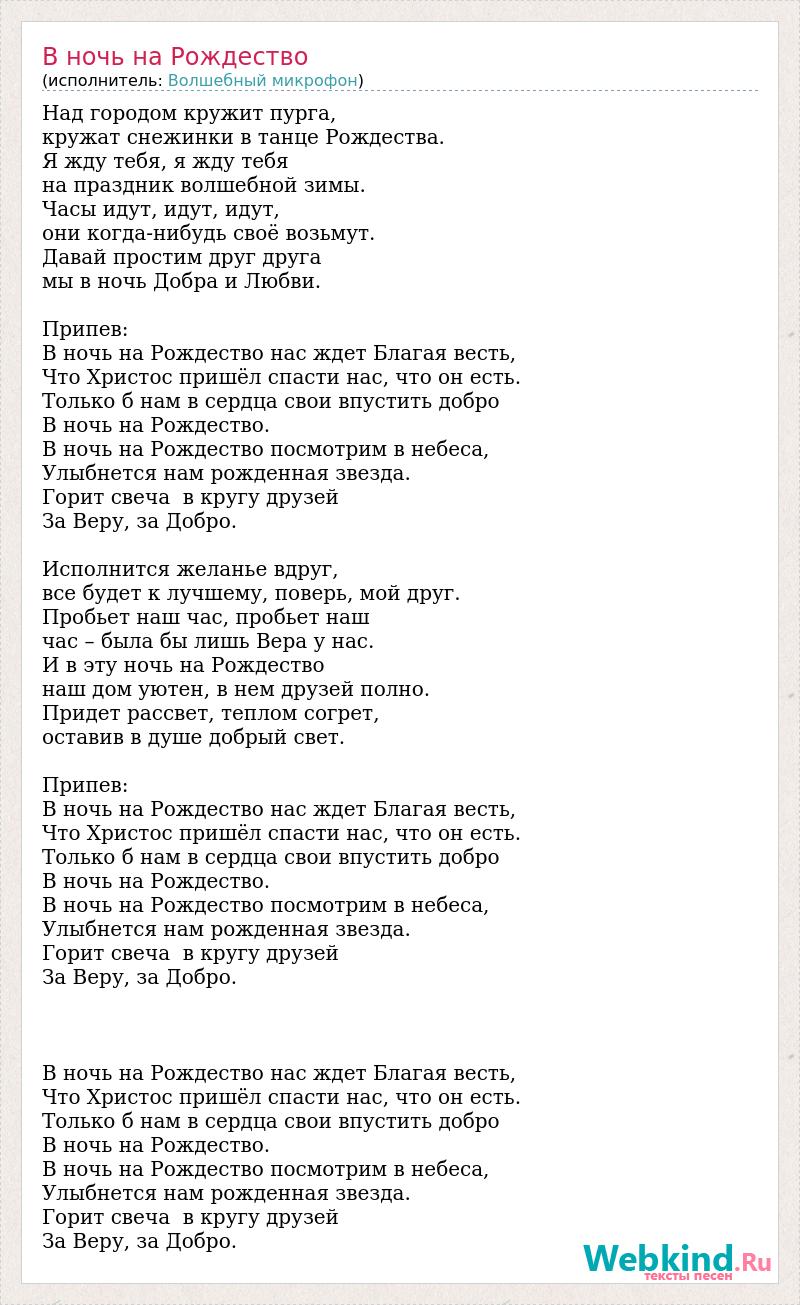 Над городом кружит пурга, кружат снежинки в танце Рождества. Я жду тебя, я жду тебя на праздник волшебной зимы. Часы идут, идут, идут, они когда-нибудь своё возьмут. Давай простим друг друга мы в ночь Добра и Любви. Припев: В ночь на Рождество нас ждет Благая весть, Что Христос пришёл спасти нас, что он есть. Только б нам в сердца свои впустить добро В ночь на Рождество. В ночь на Рождество посмотрим в небеса, Улыбнется нам рожденная звезда. Горит свеча в кругу друзей За Веру, за Добро. Исполнится желанье вдруг, все будет к лучшему, поверь, мой друг. Пробьет наш час, пробьет наш час – была бы лишь Вера у нас. И в эту ночь на Рождество наш дом уютен, в нем друзей полно. Придет рассвет, теплом согрет, оставив в душе добрый свет. Припев: В ночь на Рождество нас ждет Благая весть, Что Христос пришёл спасти нас, что он есть. Только б нам в сердца свои впустить добро В ночь на Рождество. В ночь на Рождество посмотрим в небеса, Улыбнется нам рожденная звезда. Горит свеча в кругу друзей За Веру, за Добро. В ночь на Рождество нас ждет Благая весть, Что Христос пришёл спасти нас, что он есть. Только б нам в сердца свои впустить добро В ночь на Рождество. В ночь на Рождество посмотрим в небеса, Улыбнется нам рожденная звезда. Горит свеча в кругу друзей За Веру, за Добро.