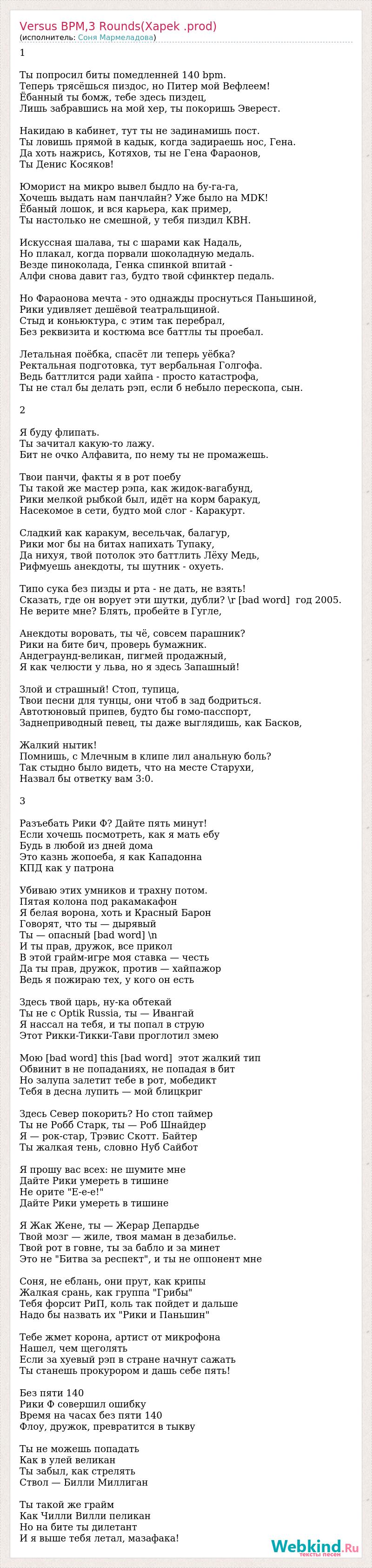 1 Ты попросил биты помедленней 140 bpm. Теперь трясёшься пиздос, но Питер мой Вефлеем! Ёбанный ты бомж, тебе здесь пиздец, Лишь забравшись на мой хер, ты покоришь Эверест. Накидаю в кабинет, тут ты не задинамишь пост. Ты ловишь прямой в кадык, когда задираешь ноc, Гена. Да хоть нажрись, Котяхов, ты не Гена Фараонов, Ты Денис Косяков! Юморист на микро вывел быдло на бу-га-га, Хочешь выдать нам панчлайн? Уже было на MDK! Ёбаный лошок, и вся карьера, как пример, Ты настолько не смешной, у тебя пиздил КВН. Искуссная шалава, ты с шарами как Надаль, Но плакал, когда порвали шоколадную медаль. Везде пиноколада, Генка спинкой впитай - Алфи снова давит газ, будто твой сфинктер педаль. Но Фараонова мечта - это однажды проснуться Паньшиной, Рики удивляет дешёвой театральщиной. Стыд и коньюктура, с этим так перебрал, Без реквизита и костюма все баттлы ты проебал. Летальная поёбка, спасёт ли теперь уёбка? Ректальная подготовка, тут вербальная Голгофа. Ведь баттлится ради хайпа - просто катастрофа, Ты не стал бы делать рэп, если б небыло перескопа, сын. 2 Я буду флипать. Ты зачитал какую-то лажу. Бит не очко Алфавита, по нему ты не промажешь. Твои панчи, факты я в рот поебу Ты такой же мастер рэпа, как жидок-вагабунд, Рики мелкой рыбкой был, идёт на корм баракуд, Насекомое в сети, будто мой слог - Каракурт. Сладкий как каракум, весельчак, балагур, Рики мог бы на битах напихать Тупаку, Да нихуя, твой потолок это баттлить Лёху Медь, Рифмуешь анекдоты, ты шутник - охуеть. Типо сука без пизды и рта - не дать, не взять! Сказать, где он ворует эти шутки, дубли? \r [bad word] год 2005. Не верите мне? Блять, пробейте в Гугле, Анекдоты воровать, ты чё, совсем парашник? Рики на бите бич, проверь бумажник. Андеграунд-великан, пигмей продажный, Я как челюсти у льва, но я здесь Запашный! Злой и страшный! Стоп, тупица, Твои песни для тунцы, они чтоб в зад бодриться. Автотюновый припев, будто бы гомо-пасспорт, Заднеприводный певец, ты даже выглядишь, как Басков, Жалкий нытик! Помнишь, с Млечным в клипе лил анальную боль? Так стыдно было видеть, что на месте Старухи, Назвал бы ответку вам 3:0. 3 Разъебать Рики Ф? Дайте пять минут! Если хочешь посмотреть, как я мать ебу Будь в любой из дней дома Это казнь жопоеба, я как Кападонна КПД как у патрона Убиваю этих умников и трахну потом. Пятая колона под ракамакафон Я белая ворона, хоть и Красный Барон Говорят, что ты — дырявый Ты — опасный [bad word] \n И ты прав, дружок, все прикол В этой грайм-игре моя ставка — честь Да ты прав, дружок, против — хайпажор Ведь я пожираю тех, у кого он есть Здесь твой царь, ну-ка обтекай Ты не с Optik Russia, ты — Ивангай Я нассал на тебя, и ты попал в струю Этот Рикки-Тикки-Тави проглотил змею Мою [bad word] this [bad word] этот жалкий тип Обвинит в не попаданиях, не попадая в бит Но залупа залетит тебе в рот, мобедикт Тебя в десна лупить — мой блицкриг Здесь Север покорить? Но стоп таймер Ты не Робб Старк, ты — Роб Шнайдер Я — рок-стар, Трэвис Скотт. Байтер Ты жалкая тень, словно Нуб Сайбот Я прошу вас всех: не шумите мне Дайте Рики умереть в тишине Не орите "Е-е-е!" Дайте Рики умереть в тишине Я Жак Жене, ты — Жерар Депардье Твой мозг — жиле, твоя маман в дезабилье. Твой рот в говне, ты за бабло и за минет Это не "Битва за респект", и ты не оппонент мне Соня, не еблань, они прут, как крипы Жалкая срань, как группа "Грибы" Тебя форсит РиП, коль так пойдет и дальше Надо бы назвать их "Рики и Пань