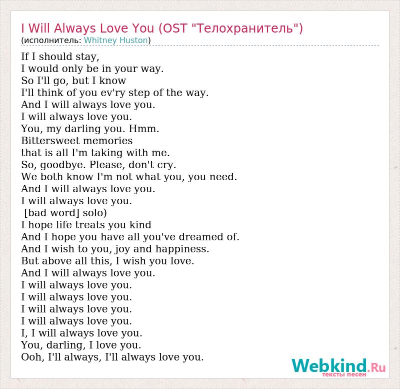 If I should stay, I would only be in your way. So I'll go, but I know I'll think of you ev'ry step of the way. And I will always love you. I will always love you. You, my darling you. Hmm. Bittersweet memories that is all I'm taking with me. So, goodbye. Please, don't cry. We both know I'm not what you, you need. And I will always love you. I will always love you. [bad word] solo) I hope life treats you kind And I hope you have all you've dreamed of. And I wish to you, joy and happiness. But above all this, I wish you love. And I will always love you. I will always love you. I will always love you. I will always love you. I will always love you. I, I will always love you. You, darling, I love you. Ooh, I'll always, I'll always love you.