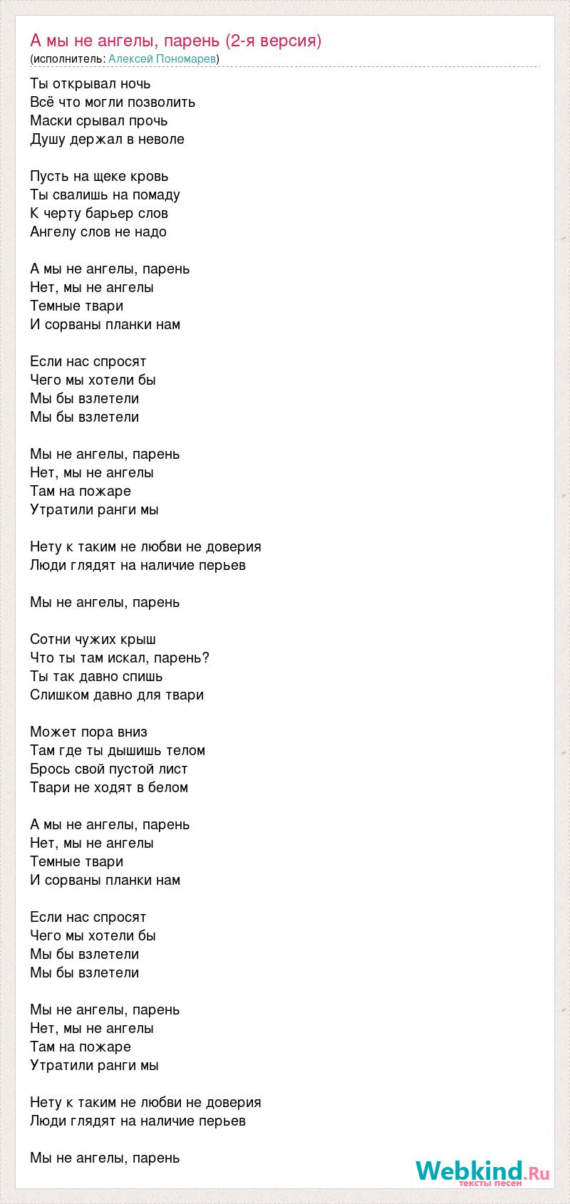 Ты открывал ночь Всё что могли позволить Маски срывал прочь Душу держал в неволе Пусть на щеке кровь Ты свалишь на помаду К черту барьер слов Ангелу слов не надо А мы не ангелы, парень Нет, мы не ангелы Темные твари И сорваны планки нам Если нас спросят Чего мы хотели бы Мы бы взлетели Мы бы взлетели Мы не ангелы, парень Нет, мы не ангелы Там на пожаре Утратили ранги мы Нету к таким не любви не доверия Люди глядят на наличие перьев Мы не ангелы, парень Сотни чужих крыш Что ты там искал, парень? Ты так давно спишь Слишком давно для твари Может пора вниз Там где ты дышишь телом Брось свой пустой лист Твари не ходят в белом А мы не ангелы, парень Нет, мы не ангелы Темные твари И сорваны планки нам Если нас спросят Чего мы хотели бы Мы бы взлетели Мы бы взлетели Мы не ангелы, парень Нет, мы не ангелы Там на пожаре Утратили ранги мы Нету к таким не любви не доверия Люди глядят на наличие перьев Мы не ангелы, парень