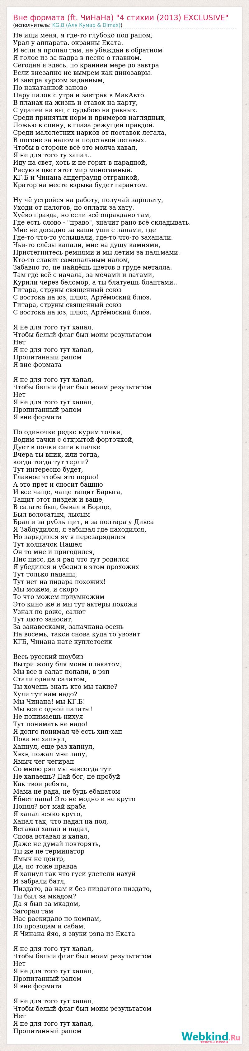 Не ищи меня, я где-то глубоко под рапом, Урал у аппарата. окраины Еката. И если я пропал там, не убеждай в обратном Я голос из-за кадра в песне о главном. Сегодня я здесь, по крайней мере до завтра Если внезапно не вымрем как динозавры. И завтра курсом заданным, По накатанной заново Пару палок с утра и завтрак в МакАвто. В планах на жизнь и ставок на карту, С удачей на вы, с судьбою на равных. Среди принятых норм и примеров наглядных, Ложью в спину, в глаза режущей правдой. Среди малолетних нарков от поставок легала, В погоне за налом и подставой легавых. Чтобы в стороне всё это молча хавал, Я не для того ту хапал.. Иду на свет, хоть и не горит в парадной, Рисую в цвет этот мир моногамный. КГ.Б и Чинана андеграунд отгранкой, Кратор на месте взрыва будет гарантом. Ну чё устройся на работу, получай зарплату, Уходи от налогов, но оплати за хату. Хуёво правда, но если всё оправдано там, Где есть слово - "право", значит рано всё складывать. Мне не досадно за ваши уши с лапами, где Где-то что-то услышали, где-то что-то захапали. Чьи-то слёзы капали, мне на душу камнями, Пристегнитесь ремнями и мы летим за пальмами. Кто-то славит самопальным налом, Забавно то, не найдёшь цветов в груде металла. Там где всё с начала, за мечами и латами, Курили через беломор, а ты блатуешь блантами.. Гитара, струны священный союз С востока на юз, плюс, Артёмоский блюз. Гитара, струны священный союз С востока на юз, плюс, Артёмоский блюз. Я не для того тут хапал, Чтобы белый флаг был моим результатом Нет Я не для того тут хапал, Пропитанный рапом Я вне формата Я не для того тут хапал, Чтобы белый флаг был моим результатом Нет Я не для того тут хапал, Пропитанный рапом Я вне формата По одиночке редко курим точки, Водим тачки с открытой форточкой, Дует в почки сиги в пачке Вчера ты вник, или тогда, когда тогда тут терли? Тут интересно будет, Главное чтобы это перло! А это прет и сносит башню И все чаще, чаще тащит Барыга, Тащит этот пиздеж и ваще, В салате был, бывал в Борще, Был волосатым, лысым Брал и за рубль щит, и за полтара у Дивса Я Заблудился, я забывал где находился, Но зарядился яу я перезарядился Тут колпачок Нашел Он то мне и пригодился, Пис писс, да я рад что тут родился Я убедился и убедил в этом прохожих Тут только пацаны, Тут нет на пидара похожих! Мы можем, и скоро То что можем приумножим Это кино же и мы тут актеры похожи Узнал по роже, салют Тут люто заносит, За занавесками, запачкана осень На восемь, такси снова куда то увозит КГБ, Чинана нате куплетосик Весь русский шоубиз Вытри жопу бля моим плакатом, Мы все в салат попали, в рэп Стали одним салатом, Ты хочешь знать кто мы такие? Хули тут нам надо? Мы Чинана! мы КГ.Б! Мы все с одной палаты! Не понимаешь нихуя Тут понимать не надо! Я долго понимал чё есть хип-хап Пока не хапнул, Хапнул, еще раз хапнул, Хэхэ, пожал мне лапу, Ямыч чег чегирап Со мною рэп мы навсегда тут Не хапаешь? Дай бог, не пробуй Как твои ребята, Мама не рада, не будь ебанатом Ёбнет папа! Это не модно и не круто Понял? вот май краба Я хапал всяко круто, Хапал так, что падал на пол, Вставал хапал и падал, Снова вставал и хапал, Даже не думай повторять, Ты же не терминатор Ямыч не центр, Да, но тоже правда Я хапнул так что гуси улетели нахуй И забрали батл, Пиздато, да нам и без пиздатого пиздато, Ты был за мкадом? Да я был за мкадом, Загорал там Нас раскидало по компам, По проводам и сабам, Я Чинана йяо