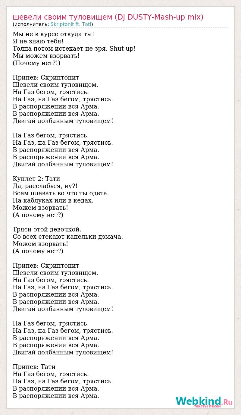 Мы не в курсе откуда ты! Я не знаю тебя! Толпа потом истекает не зря. Shut up! Мы можем взорвать! (Почему нет?!) Припев: Скриптонит Шевели своим туловищем. На Газ бегом, трястись. На Газ, на Газ бегом, трястись. В распоряжении вся Арма. В распоряжении вся Арма. Двигай долбанным туловищем! На Газ бегом, трястись. На Газ, на Газ бегом, трястись. В распоряжении вся Арма. В распоряжении вся Арма. Двигай долбанным туловищем! Куплет 2: Тати Да, расслабься, ну?! Всем плевать во что ты одета. На каблуках или в кедах. Можем взорвать! (А почему нет?) Тряси этой девочкой. Со всех стекают капельки дэмача. Можем взорвать! (А почему нет?) Припев: Скриптонит Шевели своим туловищем. На Газ бегом, трястись. На Газ, на Газ бегом, трястись. В распоряжении вся Арма. В распоряжении вся Арма. Двигай долбанным туловищем! На Газ бегом, трястись. На Газ, на Газ бегом, трястись. В распоряжении вся Арма. В распоряжении вся Арма. Двигай долбанным туловищем! Припев: Тати На Газ бегом, трястись. На Газ, на Газ бегом, трястись. В распоряжении вся Арма. В распоряжении вся Арма.