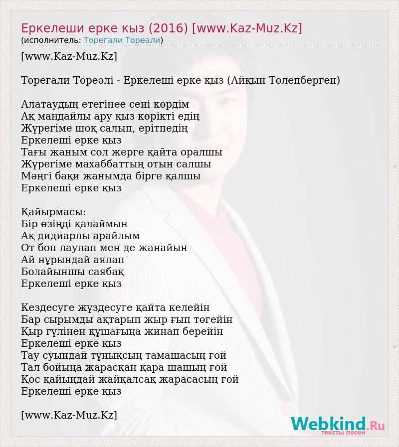 [www.Kaz-Muz.Kz] Төреғали Төреәлі - Еркелеші ерке қыз (Айқын Төлепберген) Алатаудың етегінее сені көрдім Ақ маңдайлы ару қыз көрікті едің Жүрегіме шоқ салып, ерітпедің Еркелеші ерке қыз Тағы жаным сол жерге қайта оралшы Жүрегіме махаббаттың отын салшы Мәңгі бақи жанымда бірге қалшы Еркелеші ерке қыз Қайырмасы: Бір өзіңді қалаймын Ақ дидиарлы арайлым От боп лаулап мен де жанайын Ай нұрындай аялап Болайыншы саябақ Еркелеші ерке қыз Кездесуге жүздесуге қайта келейін Бар сырымды ақтарып жыр ғып төгейін Қыр гүлінен құшағыңа жинап берейін Еркелеші ерке қыз Тау суындай тұнықсың тамашасың ғой Тал бойыңа жарасқан қара шашың ғой Қос қайыңдай жайқалсақ жарасасың ғой Еркелеші ерке қыз [www.Kaz-Muz.Kz]