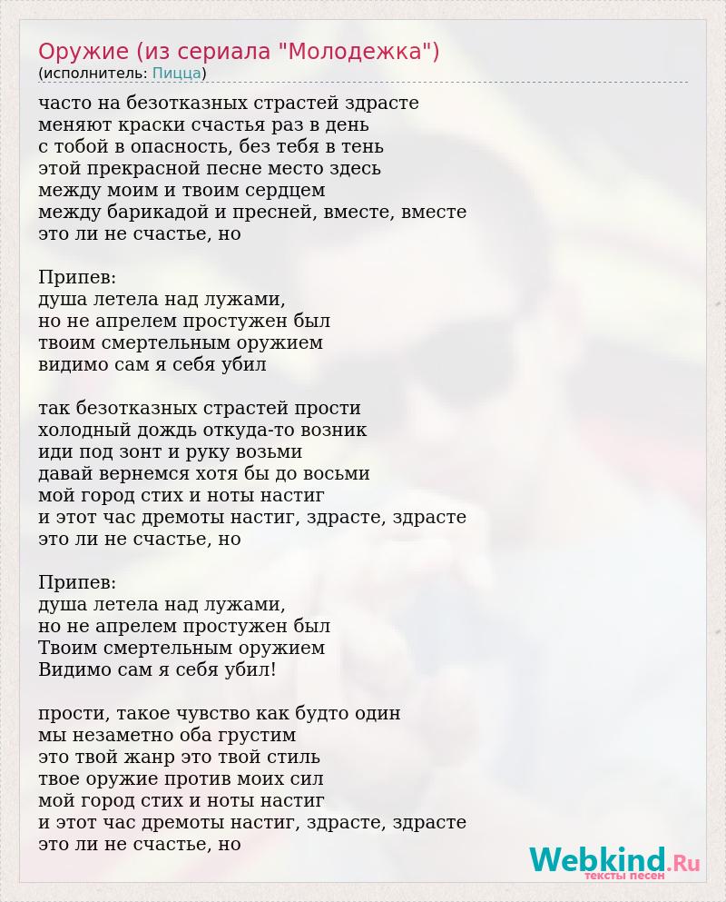 часто на безотказных страстей здрасте меняют краски счастья раз в день с тобой в опасность, без тебя в тень этой прекрасной песне место здесь между моим и твоим сердцем между барикадой и пресней, вместе, вместе это ли не счастье, но Припев: душа летела над лужами, но не апрелем простужен был твоим смертельным оружием видимо сам я себя убил так безотказных страстей прости холодный дождь откуда-то возник иди под зонт и руку возьми давай вернемся хотя бы до восьми мой город стих и ноты настиг и этот час дремоты настиг, здрасте, здрасте это ли не счастье, но Припев: душа летела над лужами, но не апрелем простужен был Твоим смертельным оружием Видимо сам я себя убил! прости, такое чувство как будто один мы незаметно оба грустим это твой жанр это твой стиль твое оружие против моих сил мой город стих и ноты настиг и этот час дремоты настиг, здрасте, здрасте это ли не счастье, но