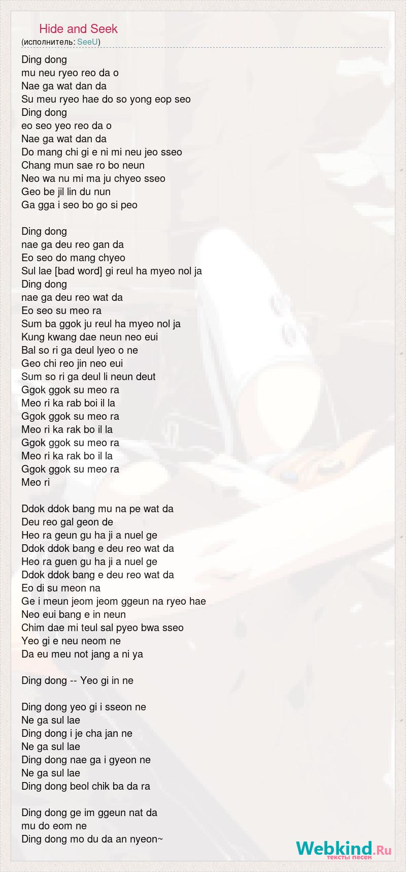 Ding dong mu neu ryeo reo da o Nae ga wat dan da Su meu ryeo hae do so yong eop seo Ding dong eo seo yeo reo da o Nae ga wat dan da Do mang chi gi e ni mi neu jeo sseo Chang mun sae ro bo neun Neo wa nu mi ma ju chyeo sseo Geo be jil lin du nun Ga gga i seo bo go si peo Ding dong nae ga deu reo gan da Eo seo do mang chyeo Sul lae [bad word] gi reul ha myeo nol ja Ding dong nae ga deu reo wat da Eo seo su meo ra Sum ba ggok ju reul ha myeo nol ja Kung kwang dae neun neo eui Bal so ri ga deul lyeo o ne Geo chi reo jin neo eui Sum so ri ga deul li neun deut Ggok ggok su meo ra Meo ri ka rab boi il la Ggok ggok su meo ra Meo ri ka rak bo il la Ggok ggok su meo ra Meo ri ka rak bo il la Ggok ggok su meo ra Meo ri Ddok ddok bang mu na pe wat da Deu reo gal geon de Heo ra geun gu ha ji a nuel ge Ddok ddok bang e deu reo wat da Heo ra guen gu ha ji a nuel ge Ddok ddok bang e deu reo wat da Eo di su meon na Ge i meun jeom jeom ggeun na ryeo hae Neo eui bang e in neun Chim dae mi teul sal pyeo bwa sseo Yeo gi e neu neom ne Da eu meu not jang a ni ya Ding dong -- Yeo gi in ne Ding dong yeo gi i sseon ne Ne ga sul lae Ding dong i je cha jan ne Ne ga sul lae Ding dong nae ga i gyeon ne Ne ga sul lae Ding dong beol chik ba da ra Ding dong ge im ggeun nat da mu do eom ne Ding dong mo du da an nyeon~