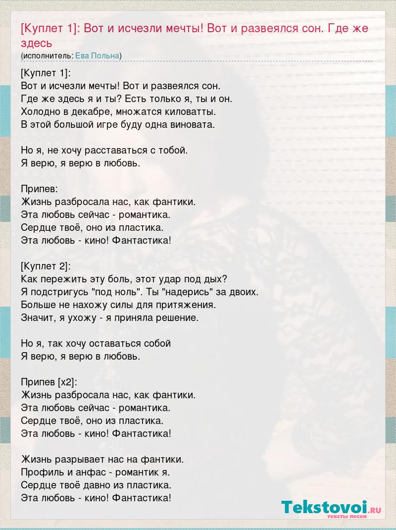 [Куплет 1]: Вот и исчезли мечты! Вот и развеялся сон. Где же здесь я и ты? Есть только я, ты и он. Холодно в декабре, множатся киловатты. В этой большой игре буду одна виновата. Но я, не хочу расставаться с тобой. Я верю, я верю в любовь. Припев: Жизнь разбросала нас, как фантики. Эта любовь сейчас - романтика. Сердце твоё, оно из пластика. Эта любовь - кино! Фантастика! [Куплет 2]: Как пережить эту боль, этот удар под дых? Я подстригусь "под ноль". Ты "надерись" за двоих. Больше не нахожу силы для притяжения. Значит, я ухожу - я приняла решение. Но я, так хочу оставаться собой Я верю, я верю в любовь. Припев [x2]: Жизнь разбросала нас, как фантики. Эта любовь сейчас - романтика. Сердце твоё, оно из пластика. Эта любовь - кино! Фантастика! Жизнь разрывает нас на фантики. Профиль и анфас - романтик я. Сердце твоё давно из пластика. Эта любовь - кино! Фантастика!