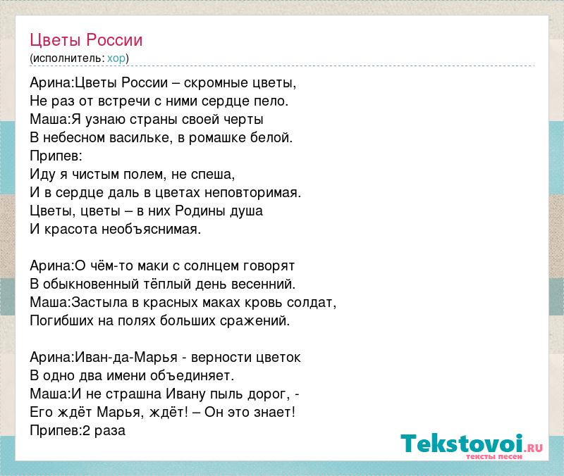 Арина:Цветы России – скромные цветы, Не раз от встречи с ними сердце пело. Маша:Я узнаю страны своей черты В небесном васильке, в ромашке белой. Припев: Иду я чистым полем, не спеша, И в сердце даль в цветах неповторимая. Цветы, цветы – в них Родины душа И красота необъяснимая. Арина:О чём-то маки с солнцем говорят В обыкновенный тёплый день весенний. Маша:Застыла в красных маках кровь солдат, Погибших на полях больших сражений. Арина:Иван-да-Марья - верности цветок В одно два имени объединяет. Маша:И не страшна Ивану пыль дорог, - Его ждёт Марья, ждёт! – Он это знает! Припев:2 раза