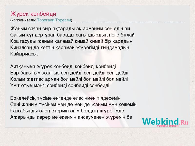 Жаным саған сыр ақтарады ақ арманым сен едің ай Сағым күндер ұзап барады сағындырдың неге бұлай Қоштасуды жаным қаламай қимай қимай бір қарадың Қиналсаң да кеттің қарамай жүрегімді тыңдамадың Қайырмасы: Айтқаныма жүрек көнбейді көнбейді көнбейді Бар бақытым жалғыз сен дейді сен дейді сен дейді Қолым жетпес арман бол мейлі бол мейлі бол мейлі Үміт отым мәңгі сөнбейді сөнбейді сөнбейді Еркелейсің түсіме енгенде елесіңмен тілдесемін Сені жаным түсінем мен де мен де жаным мұң кешемін Ғажабыңды өлең етермін әнім болдың жүрегімде Ажарыңды көрер ме екенмін аңсауменен жүремін бе