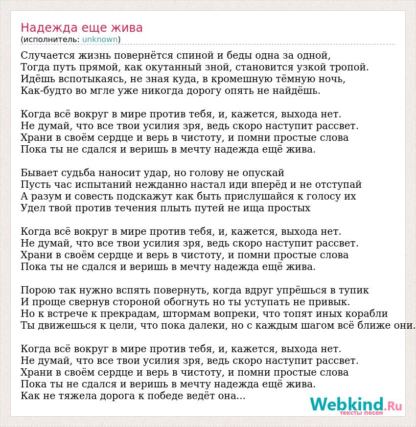 Случается жизнь повернётся спиной и беды одна за одной, Тогда путь прямой, как окутанный зной, становится узкой тропой. Идёшь вспотыкаясь, не зная куда, в кромешную тёмную ночь, Как-будто во мгле уже никогда дорогу опять не найдёшь. Когда всё вокруг в мире против тебя, и, кажется, выхода нет. Не думай, что все твои усилия зря, ведь скоро наступит рассвет. Храни в своём сердце и верь в чистоту, и помни простые слова Пока ты не сдался и веришь в мечту надежда ещё жива. Бывает судьба наносит удар, но голову не опускай Пусть час испытаний нежданно настал иди вперёд и не отступай А разум и совесть подскажут как быть прислушайся к голосу их Удел твой против течения плыть путей не ища простых Когда всё вокруг в мире против тебя, и, кажется, выхода нет. Не думай, что все твои усилия зря, ведь скоро наступит рассвет. Храни в своём сердце и верь в чистоту, и помни простые слова Пока ты не сдался и веришь в мечту надежда ещё жива. Порою так нужно вспять повернуть, когда вдруг упрёшься в тупик И проще свернув стороной обогнуть но ты уступать не привык. Но к встрече к прекрадам, штормам вопреки, что топят иных корабли Ты движешься к цели, что пока далеки, но с каждым шагом всё ближе они. Когда всё вокруг в мире против тебя, и, кажется, выхода нет. Не думай, что все твои усилия зря, ведь скоро наступит рассвет. Храни в своём сердце и верь в чистоту, и помни простые слова Пока ты не сдался и веришь в мечту надежда ещё жива. Как не тяжела дорога к победе ведёт она...