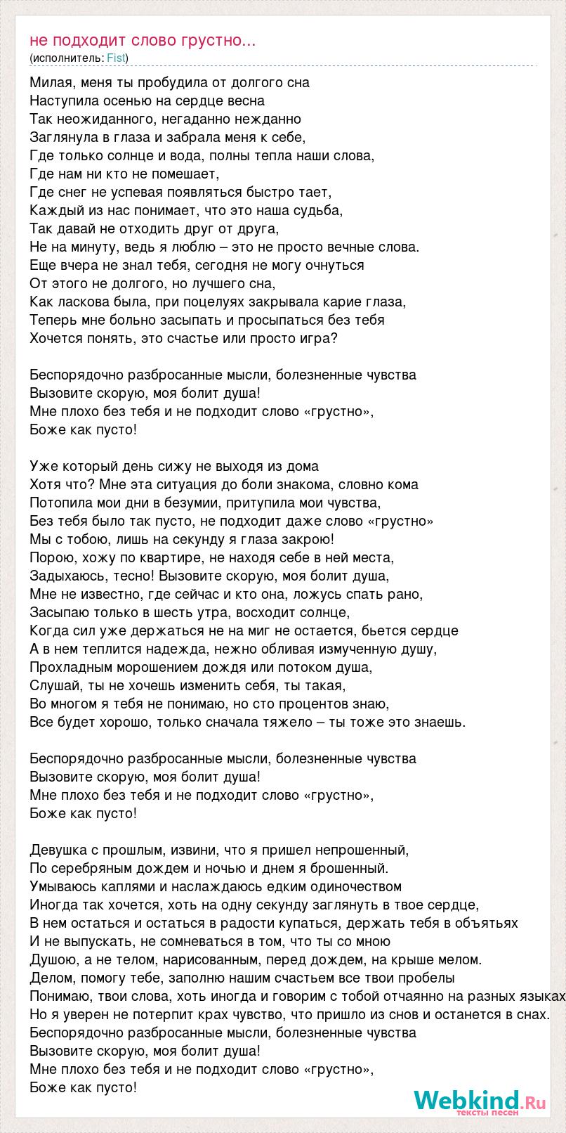 Милая, меня ты пробудила от долгого сна Наступила осенью на сердце весна Так неожиданного, негаданно нежданно Заглянула в глаза и забрала меня к себе, Где только солнце и вода, полны тепла наши слова, Где нам ни кто не помешает, Где снег не успевая появляться быстро тает, Каждый из нас понимает, что это наша судьба, Так давай не отходить друг от друга, Не на минуту, ведь я люблю – это не просто вечные слова. Еще вчера не знал тебя, сегодня не могу очнуться От этого не долгого, но лучшего сна, Как ласкова была, при поцелуях закрывала карие глаза, Теперь мне больно засыпать и просыпаться без тебя Хочется понять, это счастье или просто игра? Беспорядочно разбросанные мысли, болезненные чувства Вызовите скорую, моя болит душа! Мне плохо без тебя и не подходит слово «грустно», Боже как пусто! Уже который день сижу не выходя из дома Хотя что? Мне эта ситуация до боли знакома, словно кома Потопила мои дни в безумии, притупила мои чувства, Без тебя было так пусто, не подходит даже слово «грустно» Мы с тобою, лишь на секунду я глаза закрою! Порою, хожу по квартире, не находя себе в ней места, Задыхаюсь, тесно! Вызовите скорую, моя болит душа, Мне не известно, где сейчас и кто она, ложусь спать рано, Засыпаю только в шесть утра, восходит солнце, Когда сил уже держаться не на миг не остается, бьется сердце А в нем теплится надежда, нежно обливая измученную душу, Прохладным морошением дождя или потоком душа, Слушай, ты не хочешь изменить себя, ты такая, Во многом я тебя не понимаю, но сто процентов знаю, Все будет хорошо, только сначала тяжело – ты тоже это знаешь. Беспорядочно разбросанные мысли, болезненные чувства Вызовите скорую, моя болит душа! Мне плохо без тебя и не подходит слово «грустно», Боже как пусто! Девушка с прошлым, извини, что я пришел непрошенный, По серебряным дождем и ночью и днем я брошенный. Умываюсь каплями и наслаждаюсь едким одиночеством Иногда так хочется, хоть на одну секунду заглянуть в твое сердце, В нем остаться и остаться в радости купаться, держать тебя в объятьях И не выпускать, не сомневаться в том, что ты со мною Душою, а не телом, нарисованным, перед дождем, на крыше мелом. Делом, помогу тебе, заполню нашим счастьем все твои пробелы Понимаю, твои слова, хоть иногда и говорим с тобой отчаянно на разных языках Но я уверен не потерпит крах чувство, что пришло из снов и останется в снах. Беспорядочно разбросанные мысли, болезненные чувства Вызовите скорую, моя болит душа! Мне плохо без тебя и не подходит слово «грустно», Боже как пусто!